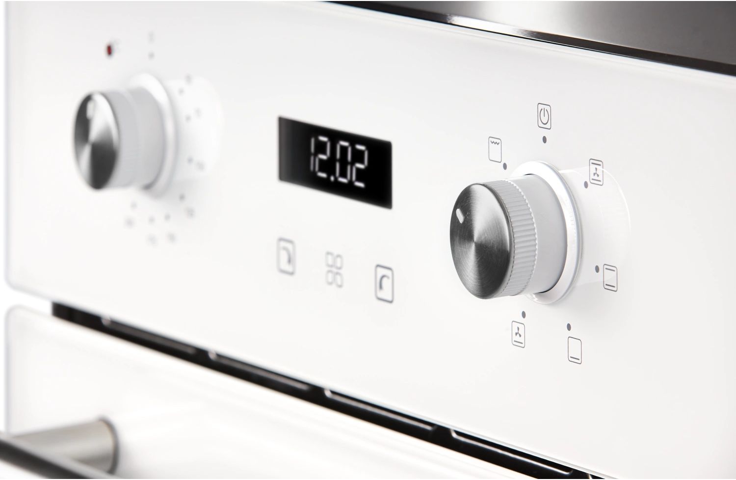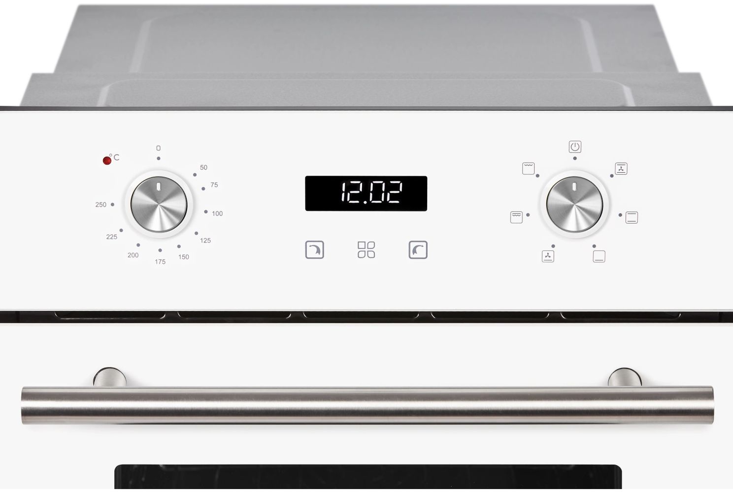 • Выбор программы и настройка температуры осуществляется с помощью поворотных регуляторов, расположенных на фронтальной части корпуса. Ручка дверцы духовки и регуляторы выполнены из металла.