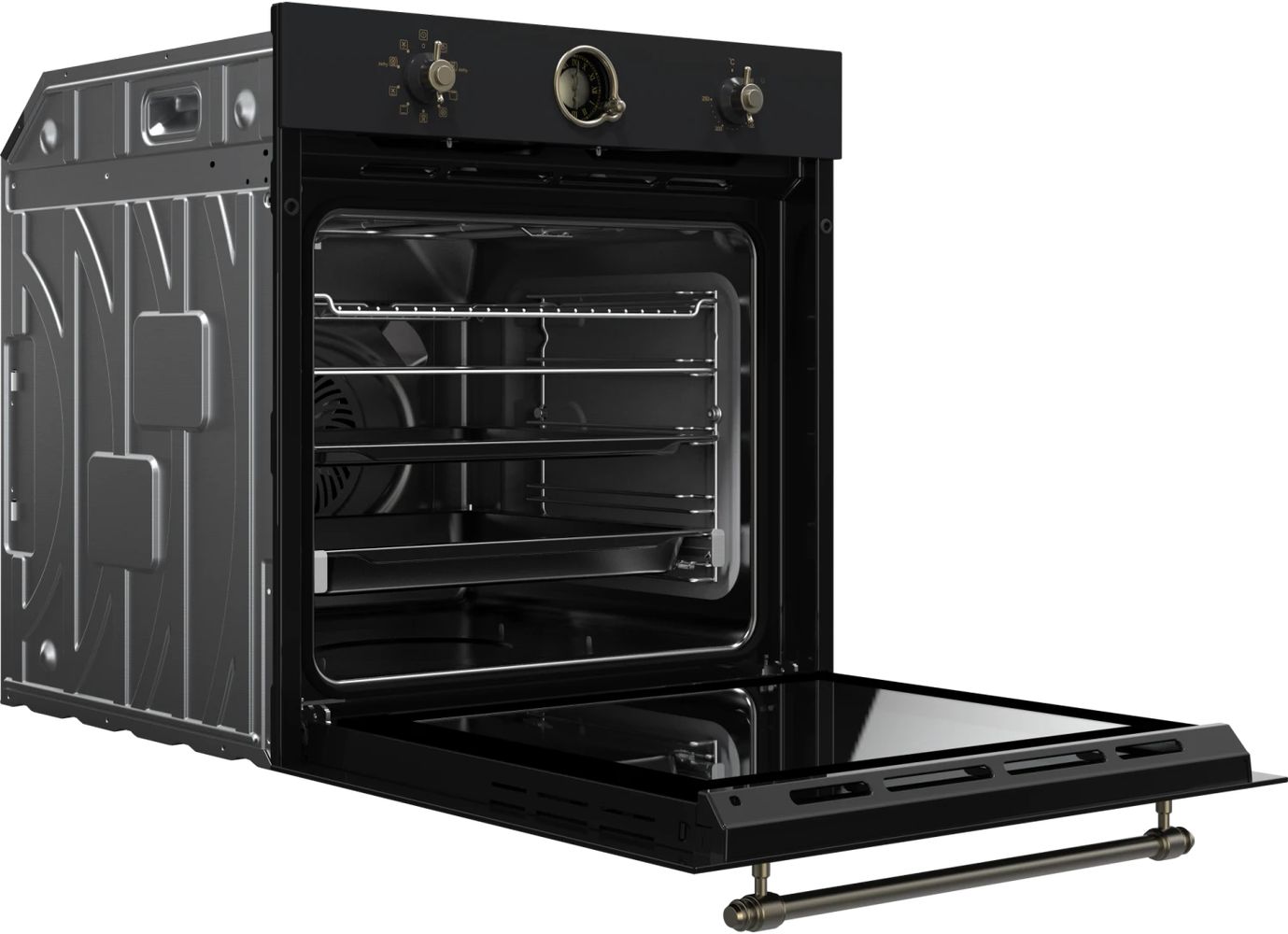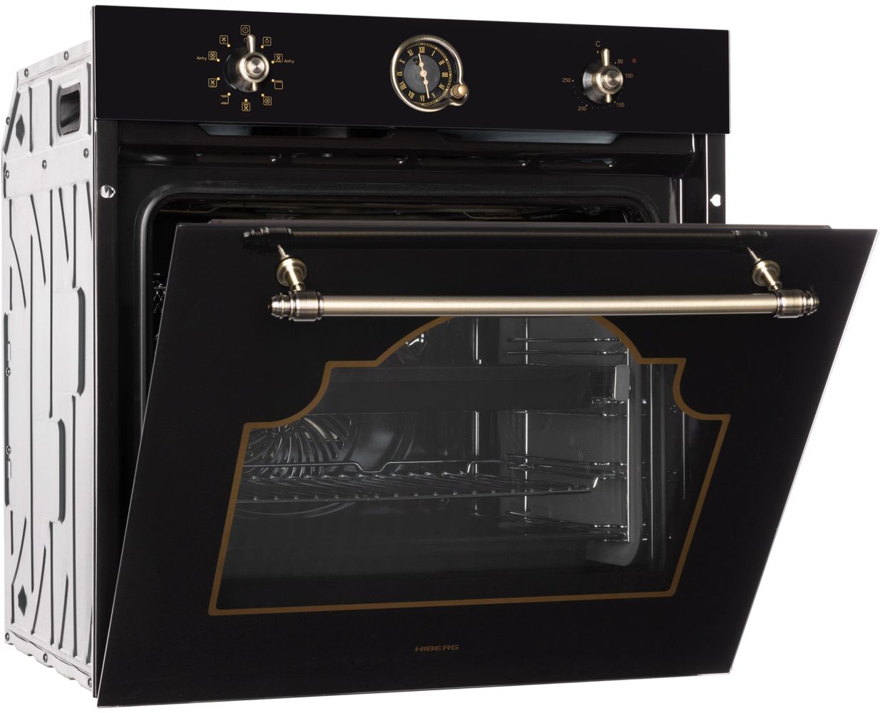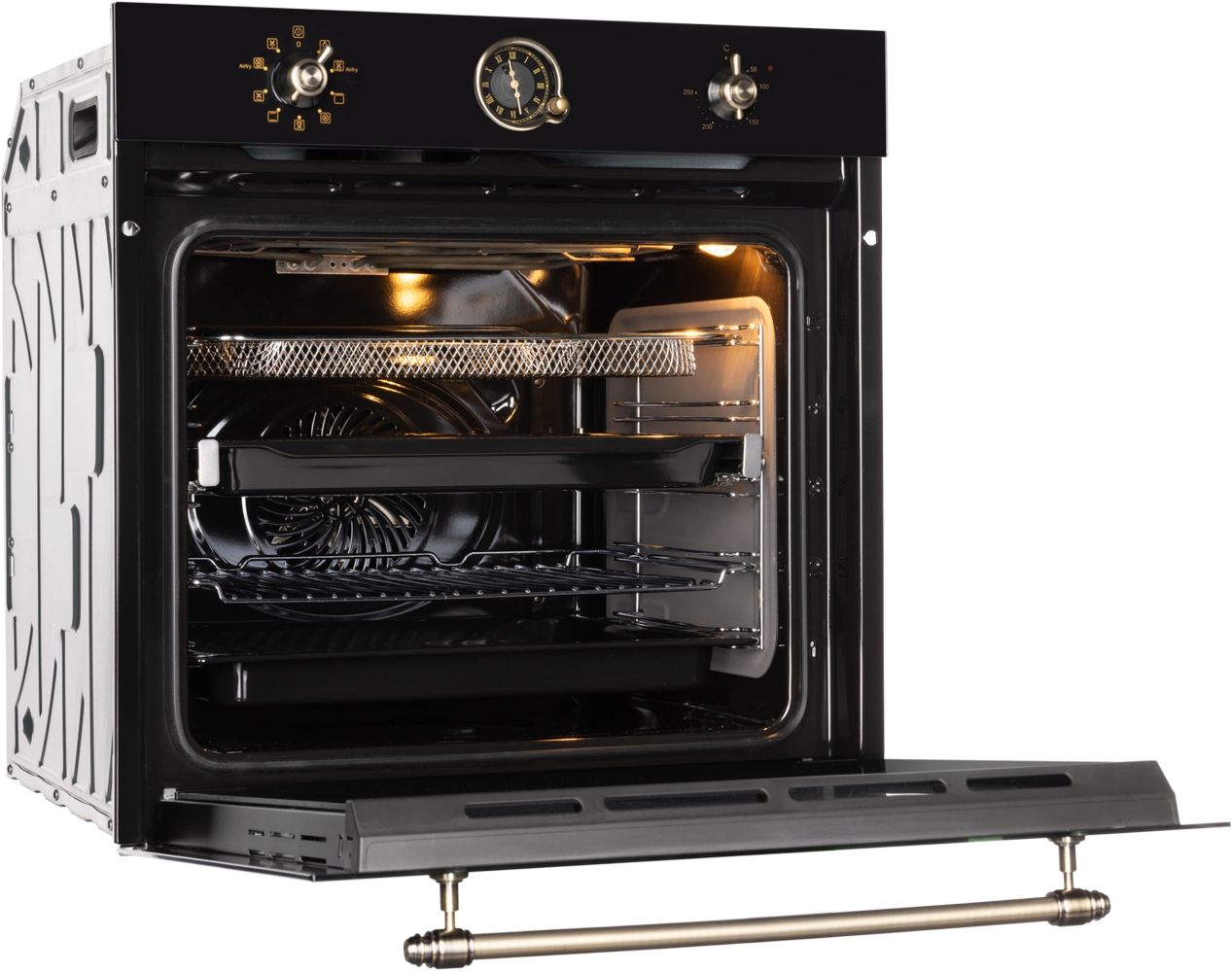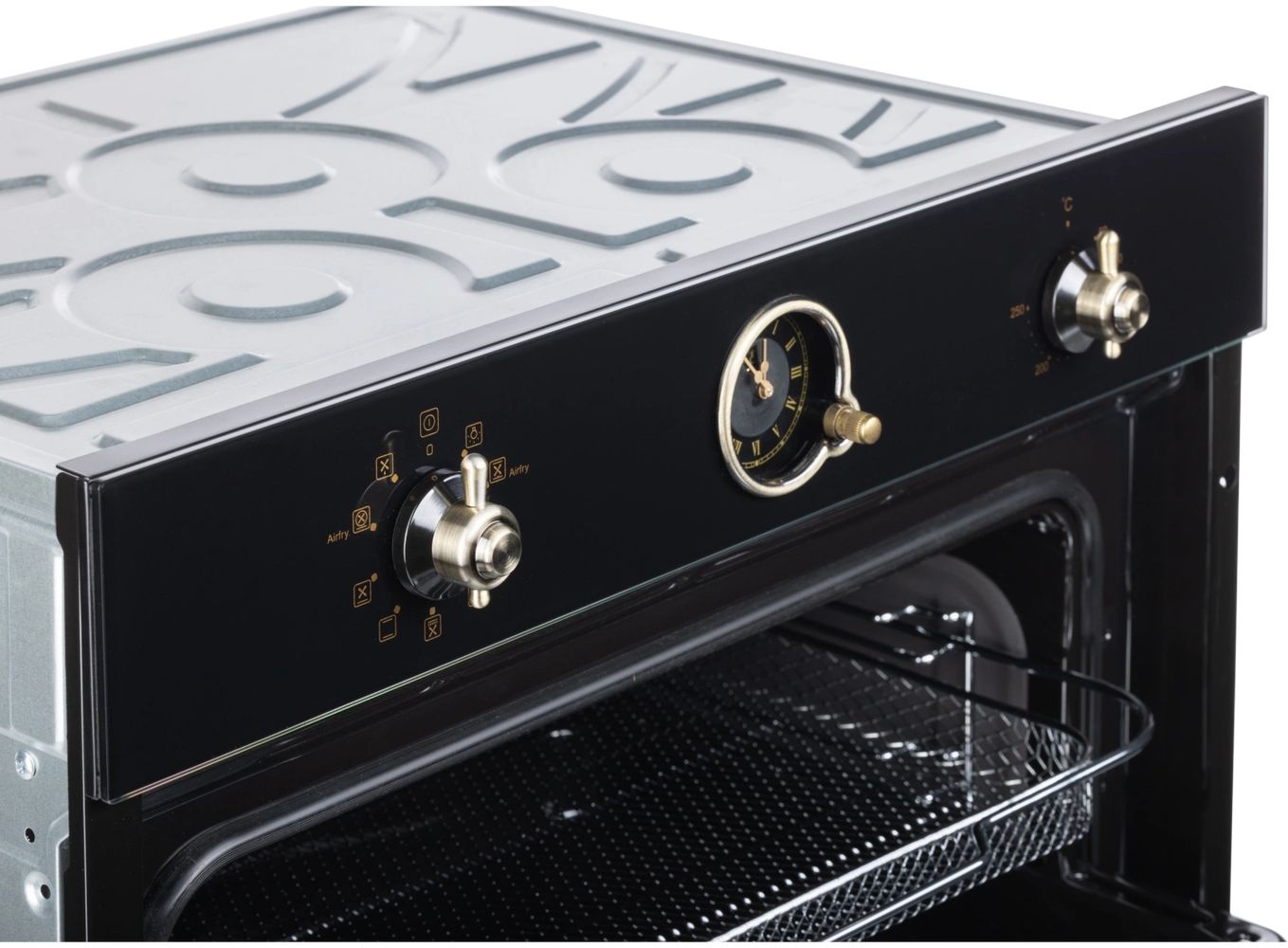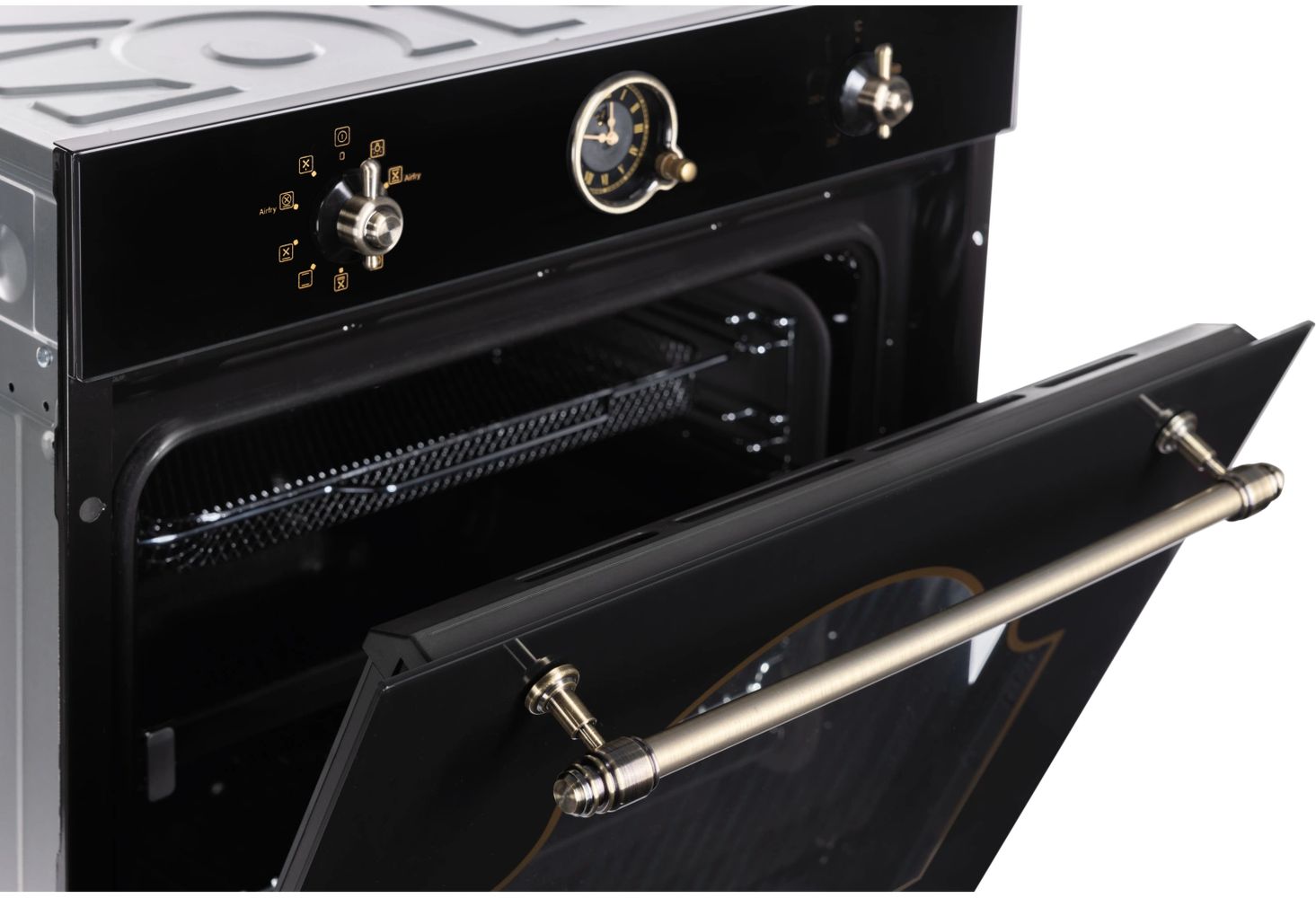 - Изысканное исполнение духового шкафа черного цвета позволит сделать его аутентичным дополнением кухонных пространств, созданных в стиле классика, винтаж или прованс. Модель с механической панелью управления дополнена декоративными поворотными переключателями и ручкой дверцы в цвете состаренной латуни.