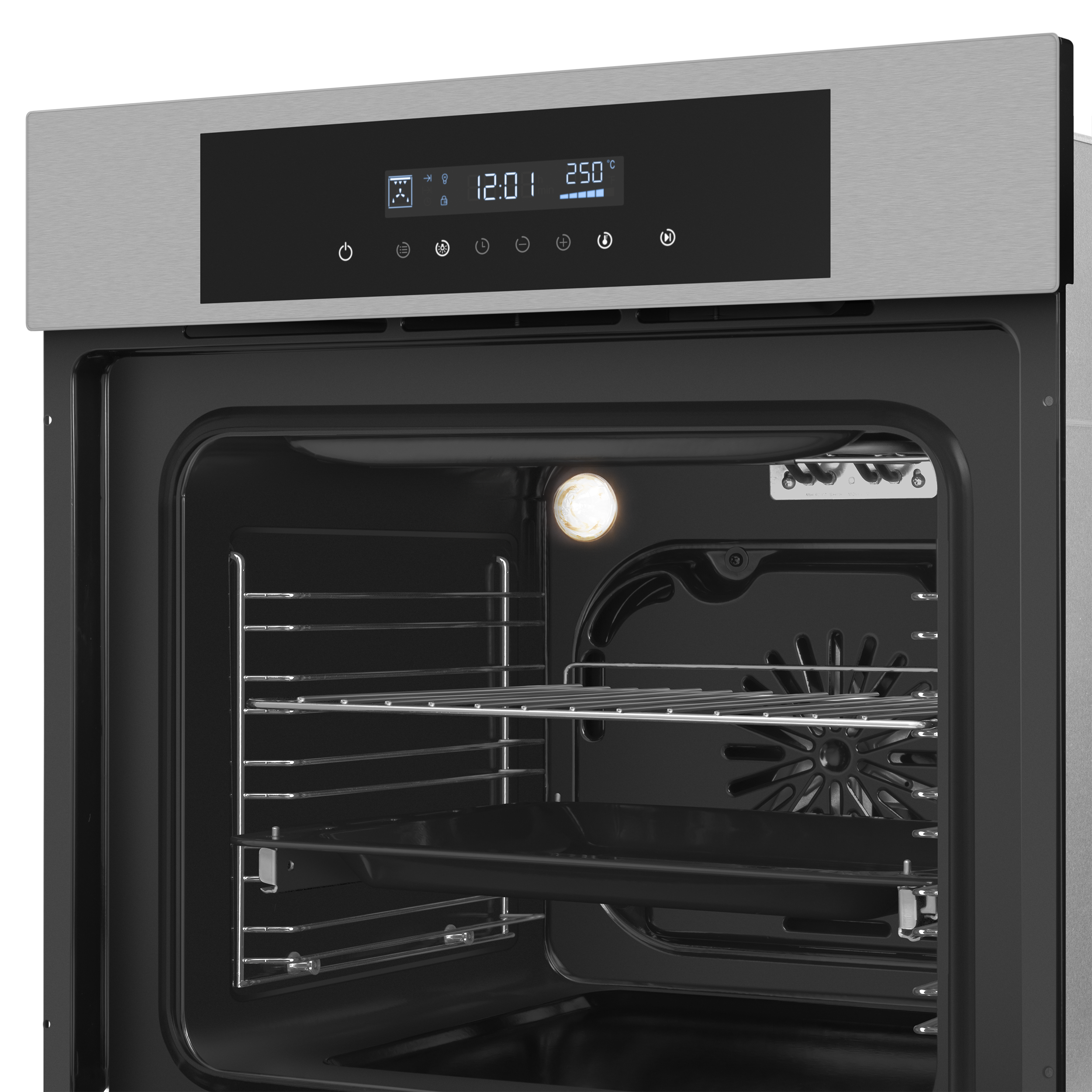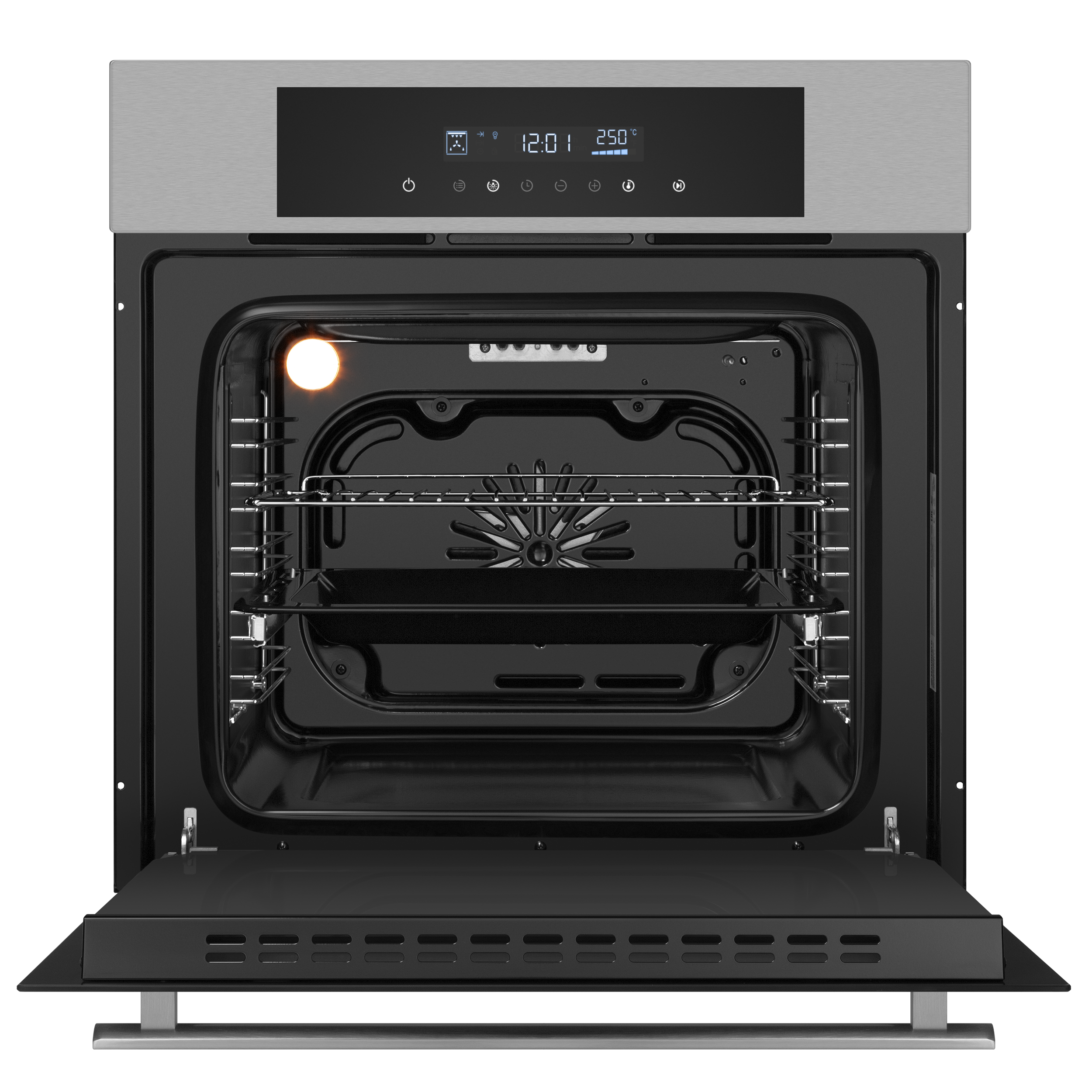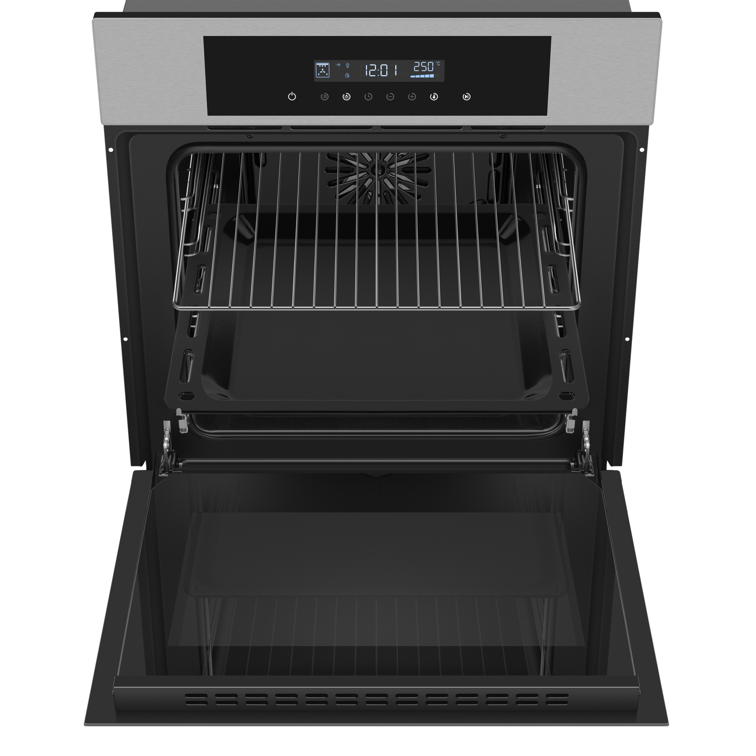 - Комплектация: стандартный противень, хромированная решетка, хромированные телескопических направляющие, хромированные направляющие