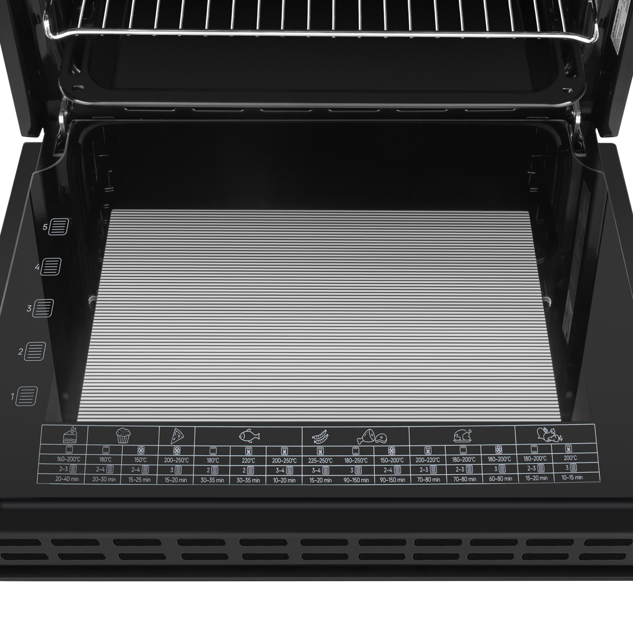 - Комплектация: противень для выпечки, хромированная решетка, 5ти уровневые хромированные направляющие