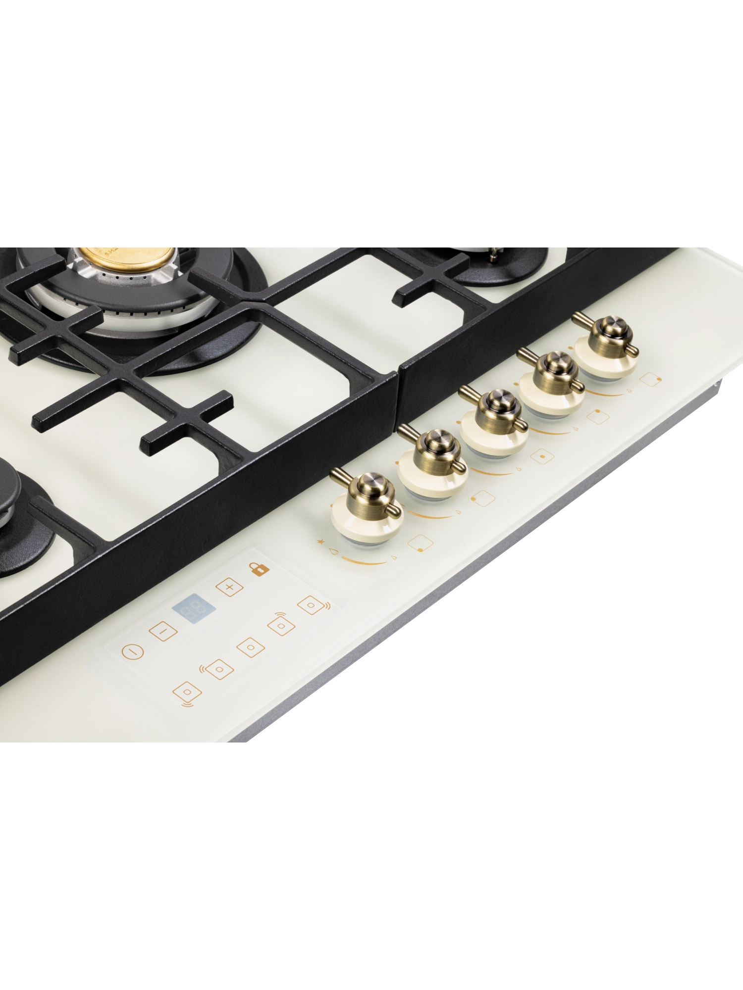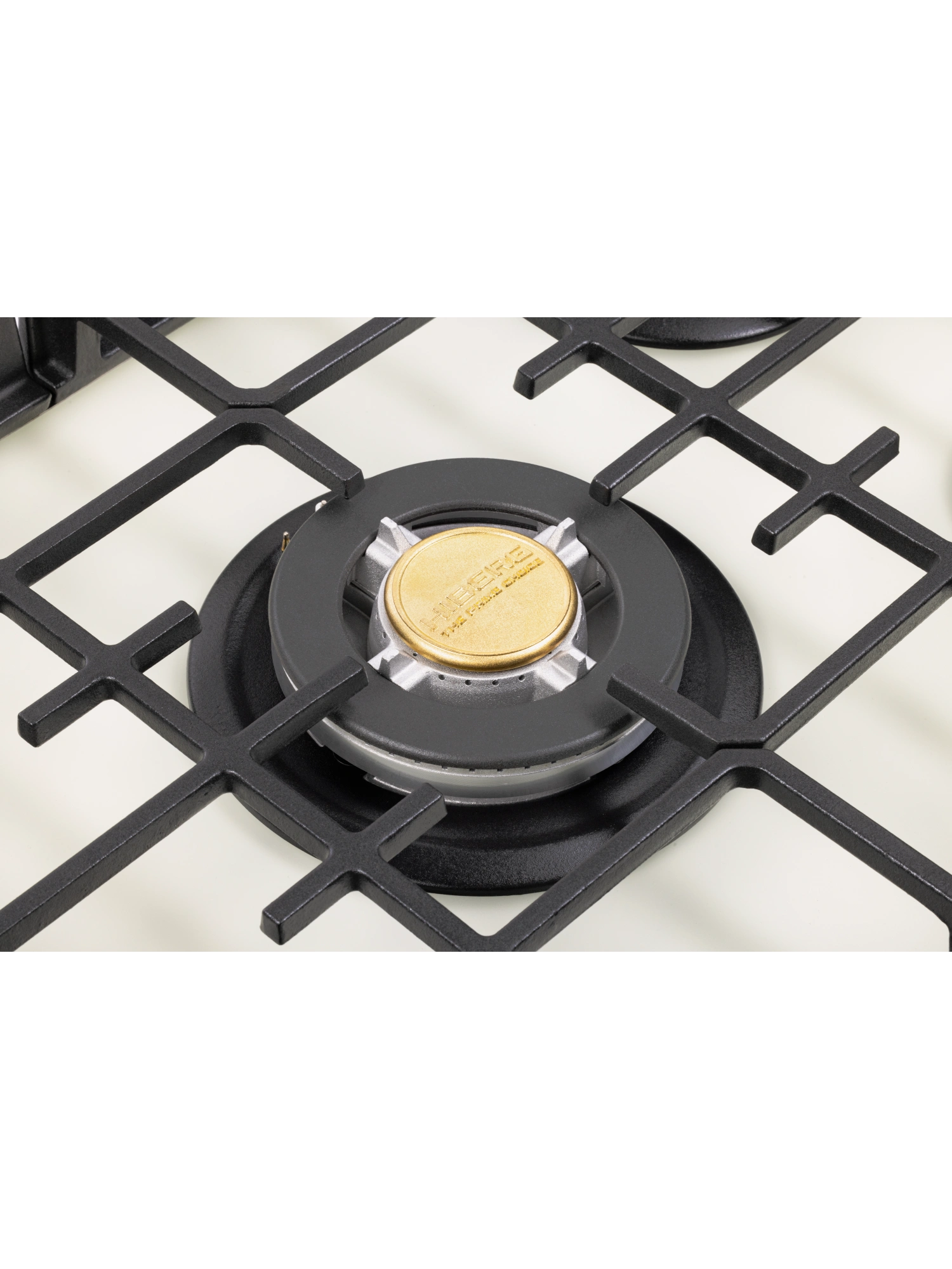 - Пять конфорок газовой варочной панели отличаются диаметром и мощностью. Дополнительная горелка позволяет готовить еще больше блюд одновременно. Самая большая конфорка – WOK с тройным рядом пламени и мощностью 3,4 кВт. Усиленный жар способен быстро нагреть толстостенную глубокую посуду с небольшим диаметром дна для приготовления азиатской кухни. Также на ней можно быстро вскипятить воду, ускорить процесс жарки мясных и рыбных блюд до хрустящей корочки при добавлении небольшого количества жира.