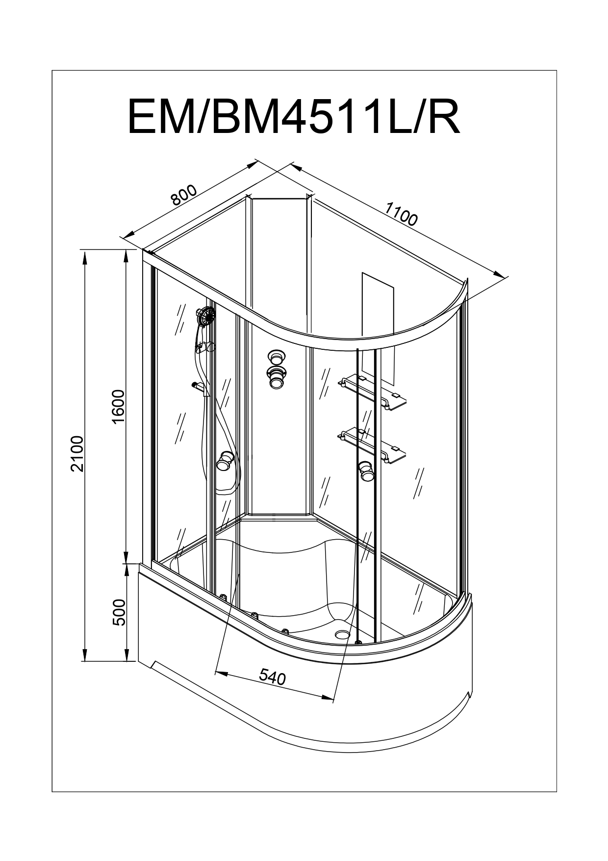 Стильная душевая кабина AvaCan EM 4511 N R с гидромассажем сочетает в себе высокую функциональность, практичность и надежность. Для изготовления применяют безопасное закаленное стекло толщиной 5 мм, надежно фиксируемое алюминиевым профилем. Цвет профиля хром. В комплекте зеркало, донный клапан (клик-клак), душевой гарнитур, смеситель, переключатель режимов, полочки, гидромассажные форсунки.