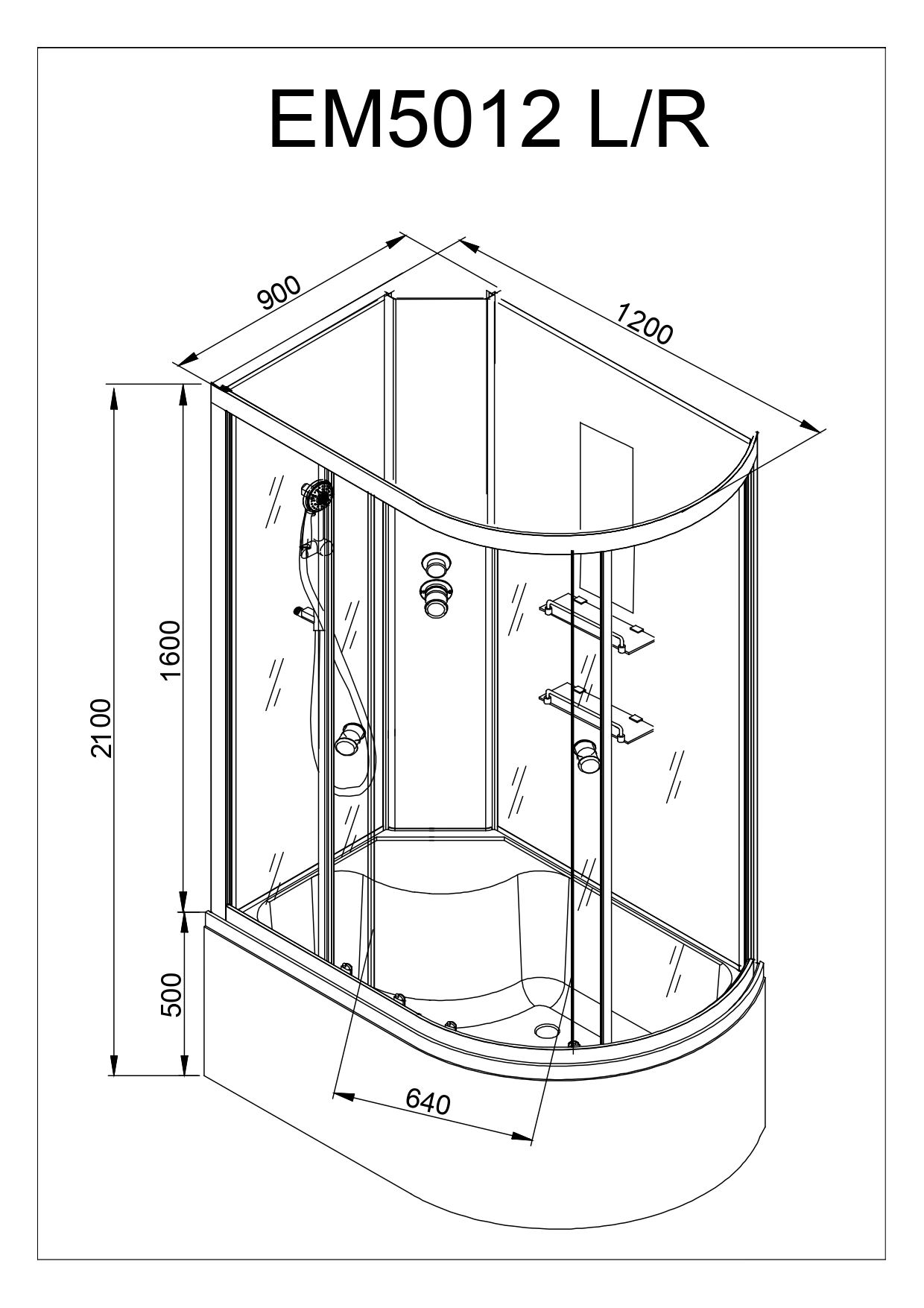 Стильная душевая кабина с внутренней сборкой AvaCan EM 5012 N L с гидромассажем сочетает в себе высокую функциональность, практичность и надежность. Для изготовления применяют безопасное закаленное стекло толщиной 5 мм, надежно фиксируемое алюминиевым профилем. Цвет профиля хром. В комплекте зеркало, донный клапан (клик-клак), душевой гарнитур, смеситель, переключатель режимов, полочки, гидромассажные форсунки.