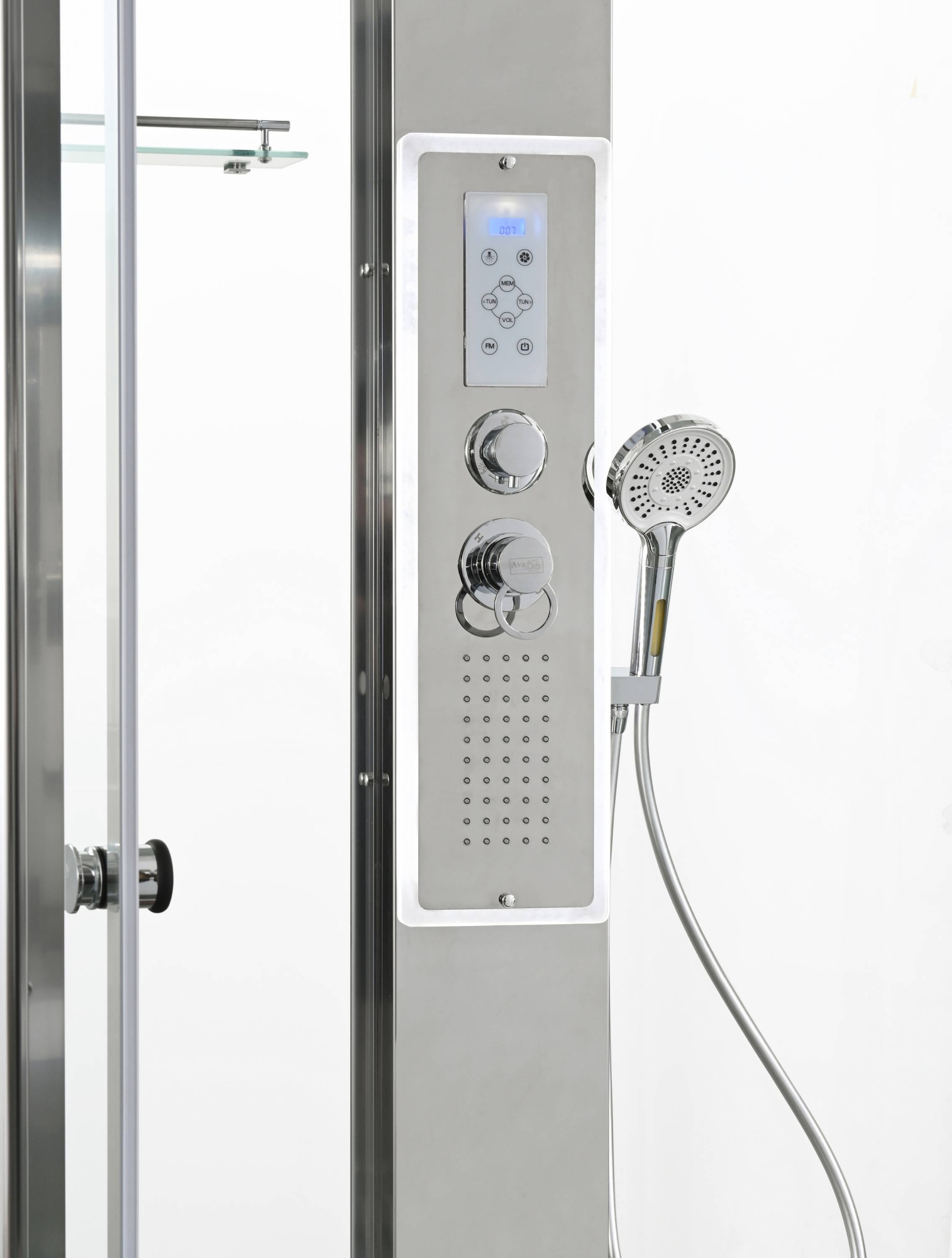 Стильная душевая кабина AvaCan сочетает в себе высокую функциональность, практичность и надежность. При изготовлении применяется безопасное закаленное стекло, надежно фиксируемое алюминиевым профилем.Профиль сделан из алюминия повышенной прочности. Сборка без силикона (увеличивает срок службы, защищает от протечек), внутренняя сборка (облегчает установку и ревизию; позволяет установить в ограниченном пространстве и обойтись без демонтажа других сантехнических приборов), смеситель резьбовой (без хомутов).Двойные металлические ролики дверей (распределение нагрузки на два ролика, увеличивают срок службы). Душевая штанга(позволяет регулировать по высоте ручную лейку), ручная арома-лейка с витамином С (картридж в комплекте,есть возможность замены или удаления картриджа), полочки(из стекла, с ограничителем), сифон с гидрозатвором, сенсорный пульт управления с функциями: блютуз, LED подсветка, радио, вытяжка, гидромассаж спины, тропический (верхний) душ.