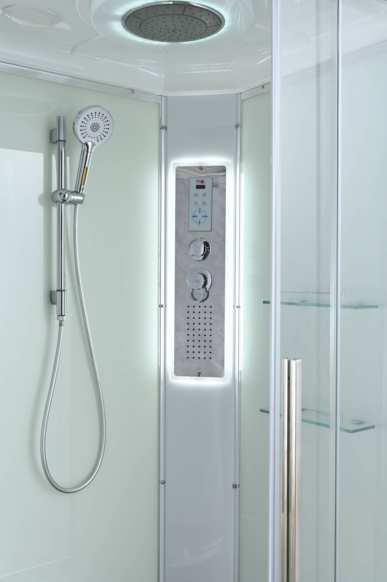 Стильная душевая кабина AvaCan сочетает в себе высокую функциональность, практичность и надежность. При изготовлении применяется безопасное закаленное стекло, надежно фиксируемое алюминиевым профилем.Профиль сделан из алюминия повышенной прочности. Сборка без силикона (увеличивает срок службы, защищает от протечек), внутренняя сборка (облегчает установку и ревизию; позволяет установить в ограниченном пространстве и обойтись без демонтажа других сантехнических приборов), смеситель резьбовой (без хомутов). Съемный экран поддона (позволяет осуществлять подключение и ревизию сифона).Двойные металлические ролики дверей (распределение нагрузки на два ролика, увеличивают срок службы). Душевая штанга(позволяет регулировать по высоте ручную лейку), ручная арома-лейка с витамином С (картридж в комплекте,есть возможность замены или удаления картриджа), полочки(из стекла, с ограничителем), сифон с гидрозатвором, сенсорный пульт управления с функциями: блютуз, LED подсветка, радио, вытяжка, гидромассаж спины, тропический (верхний) душ.