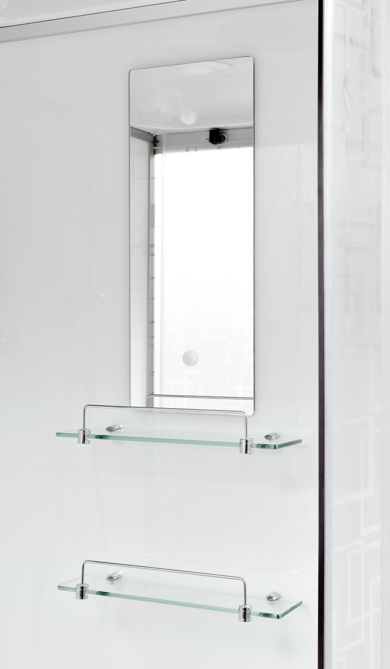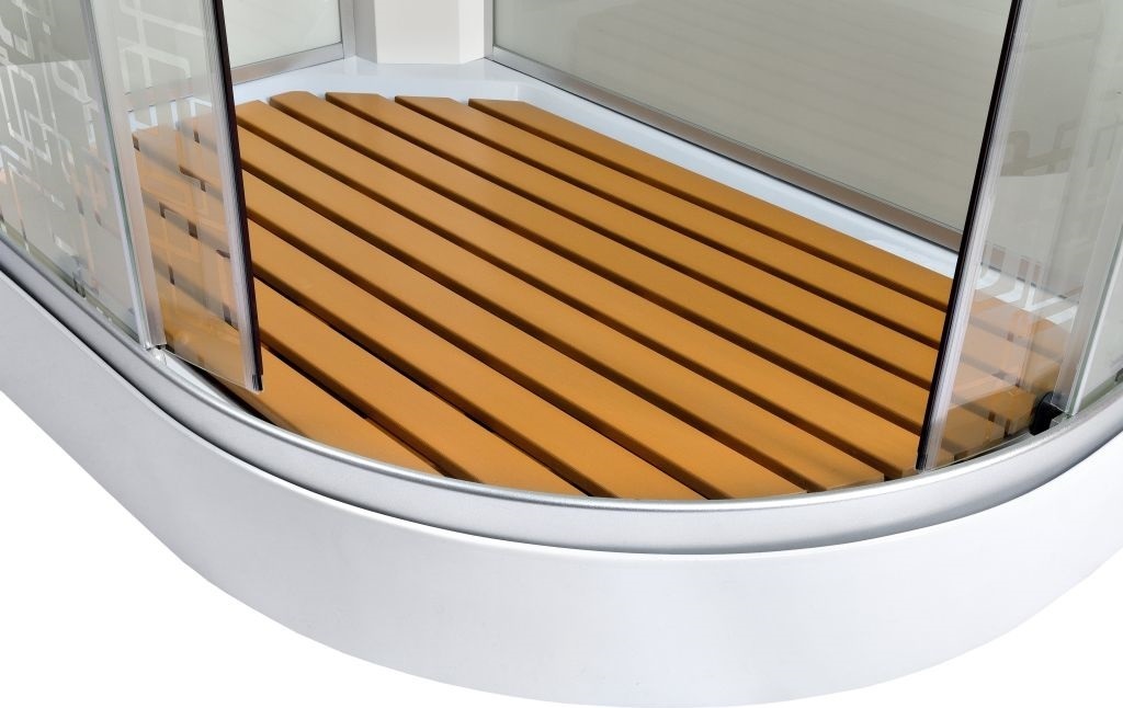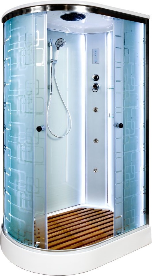 Гидробокс Deto EM1511RLed 1100х800х2200 мм, с сенсорным пультом управления, низким поддоном 150 мм и антибактериальной пластиковой вставкой (под дерево). Стекло - матовое/узор 5 мм, профиль - хром, задние стенки - белое стекло.