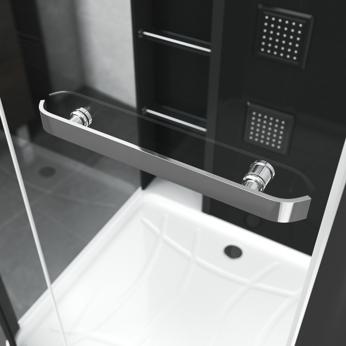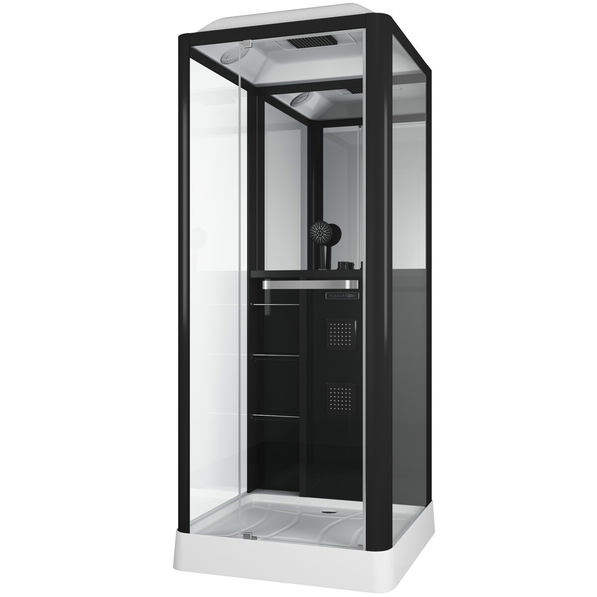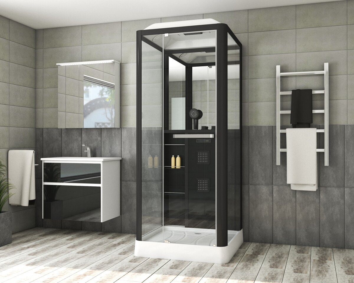 Гидробокс Grossman Alba GR221L, размер 900х900х2250 мм, левосторонняя, профиль чёрный матовый, стекло прозрачное. Ширина входа 500 мм. Низкий поддон, зеркало и полочки в комплекте.