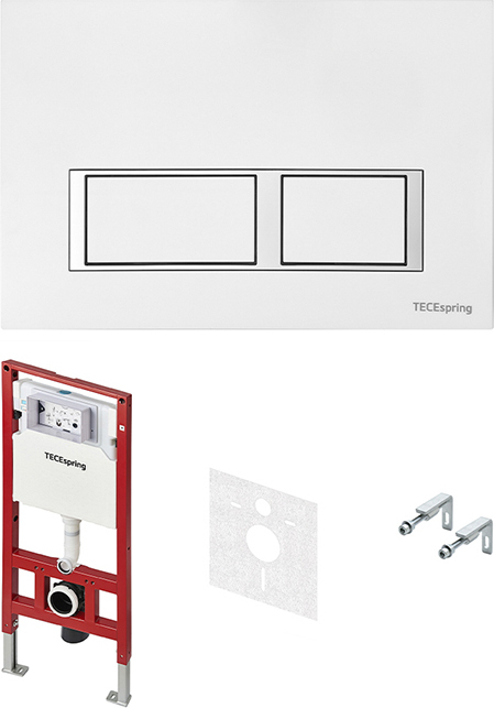 Инсталляция для подвесного унитаза TECEspring со звукоизоляционной прокладкой и панелью смыва, цвет кнопки белый глянцевый.