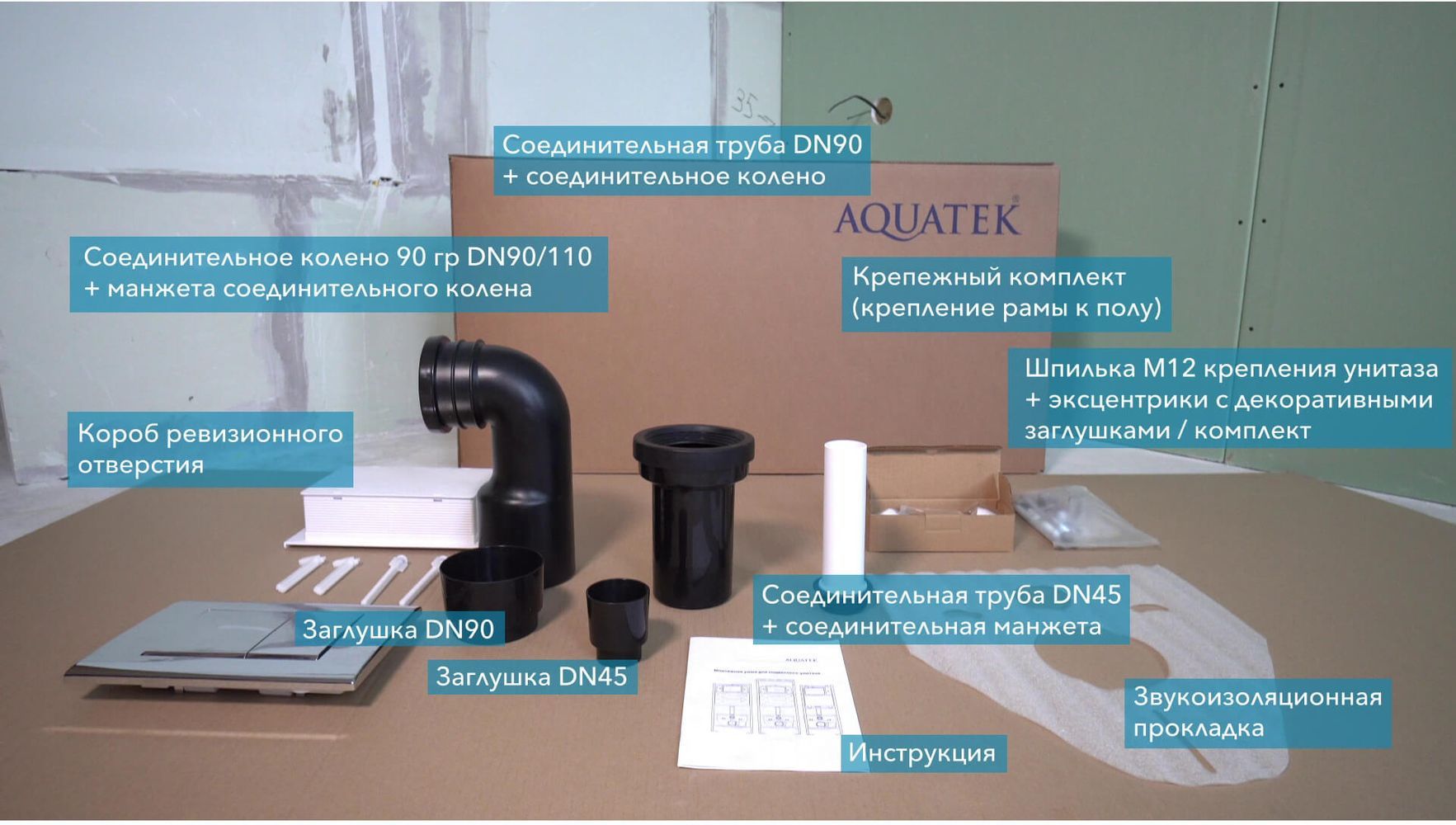 - В комплекте есть все необходимое для установки инсталляции и подсоединения унитаза. Комплект креплений к стене поставляется отдельно.