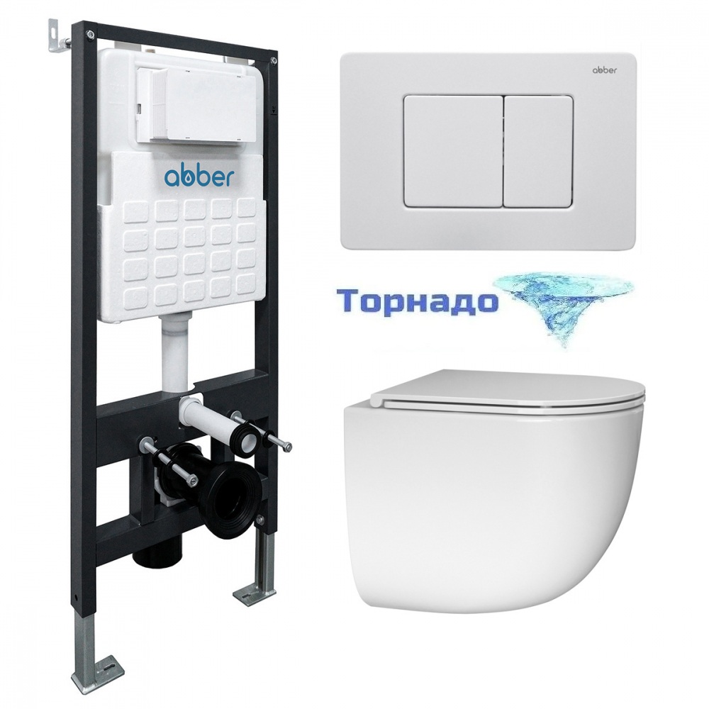 Инсталляция с подвесным унитазом комплект: Abber AC0105 с подвесным безободковым унитазом Bequem AC1132TC с крышкой микролифт, кнопка смыва AC0120MW белая матовая (система смыва Торнадо).