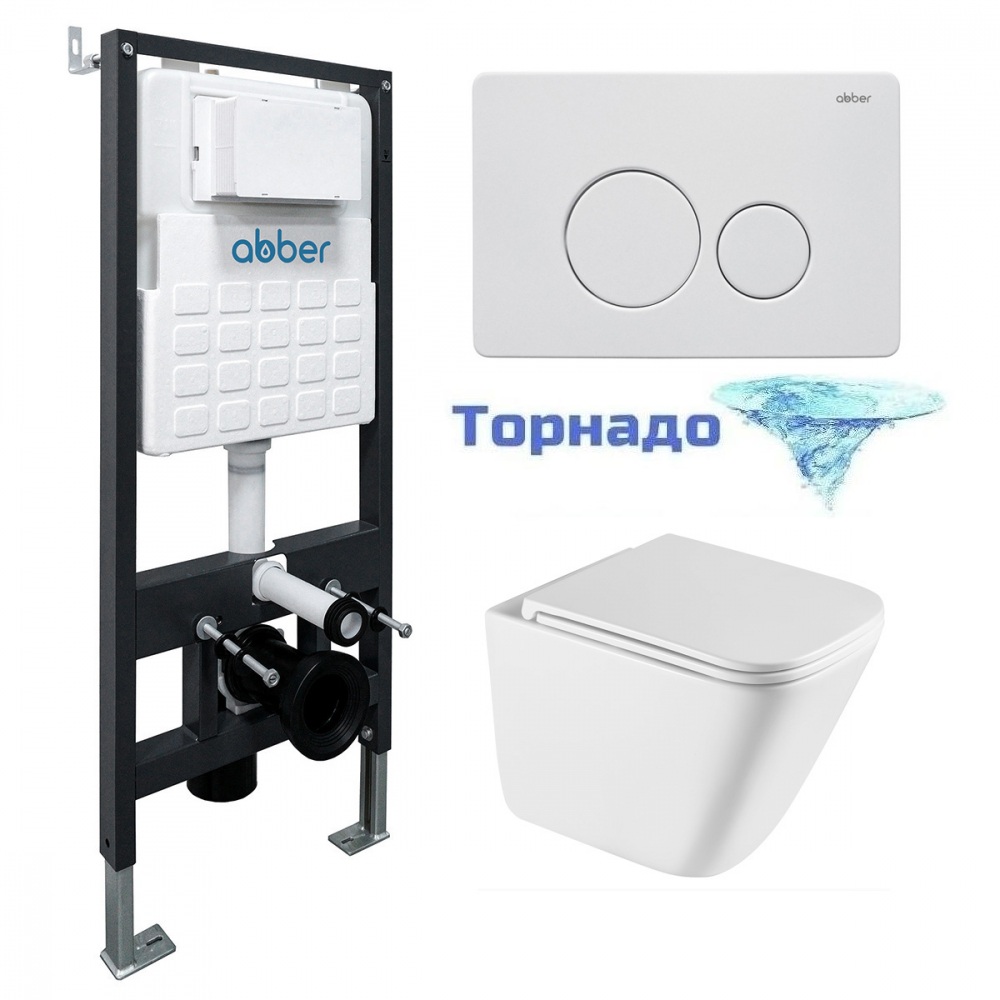 Инсталляция с подвесным унитазом комплект: Abber AC0105 с подвесным безободковым унитазом Rechteck AC1219TC с крышкой микролифт, кнопка смыва AC0121MW белая матовая (система смыва Торнадо).