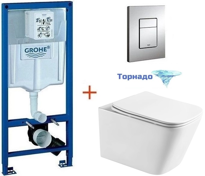 Инсталляция с подвесным унитазом комплект: Grohe Rapid SL 38772001 с подвесным безободковым унитазом Aquatek Либра AQ1505T-00 сиденье микролифт, крепление, кнопка смыва хром (Система смыва торнадо).