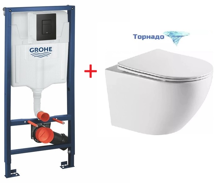 Инсталляция с подвесным унитазом комплект: Grohe Solido 38811KF0 с подвесным безободковым унитазом Azario Grado AZ-0046-UQ1 сиденье микролифт, крепление, кнопка смыва чёрная матовая (Система смыва Торнадо)