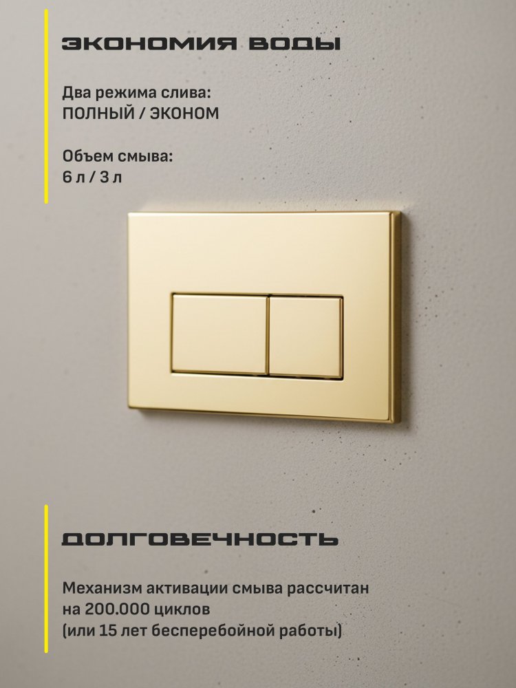 - Золотистый цвет этой кнопки станет изысканным акцентом в вашей ванной комнате, придавая ей роскошный и элегантный вид. Она не только красива, но и функциональна. Плавный и надёжный механизм обеспечивает комфортное использование, а продуманная конструкция гарантирует долгий срок службы.