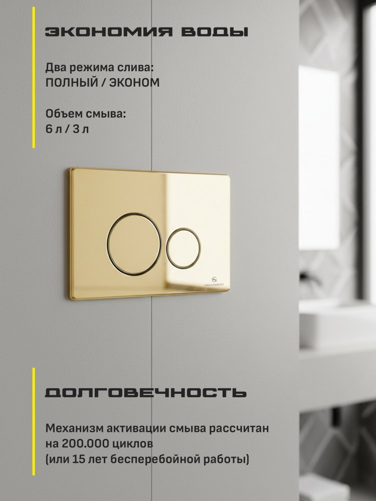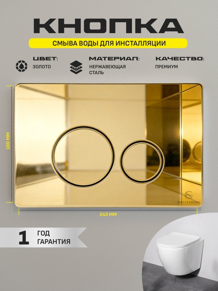 - Кнопка смыва для унитаза GROCENBERG KM3090GO — это не просто элемент сантехники, это настоящее украшение вашей ванной комнаты! С её золотистым блеском и элегантным дизайном она станет ярким акцентом в интерьере, придавая ему роскошный и изысканный вид.