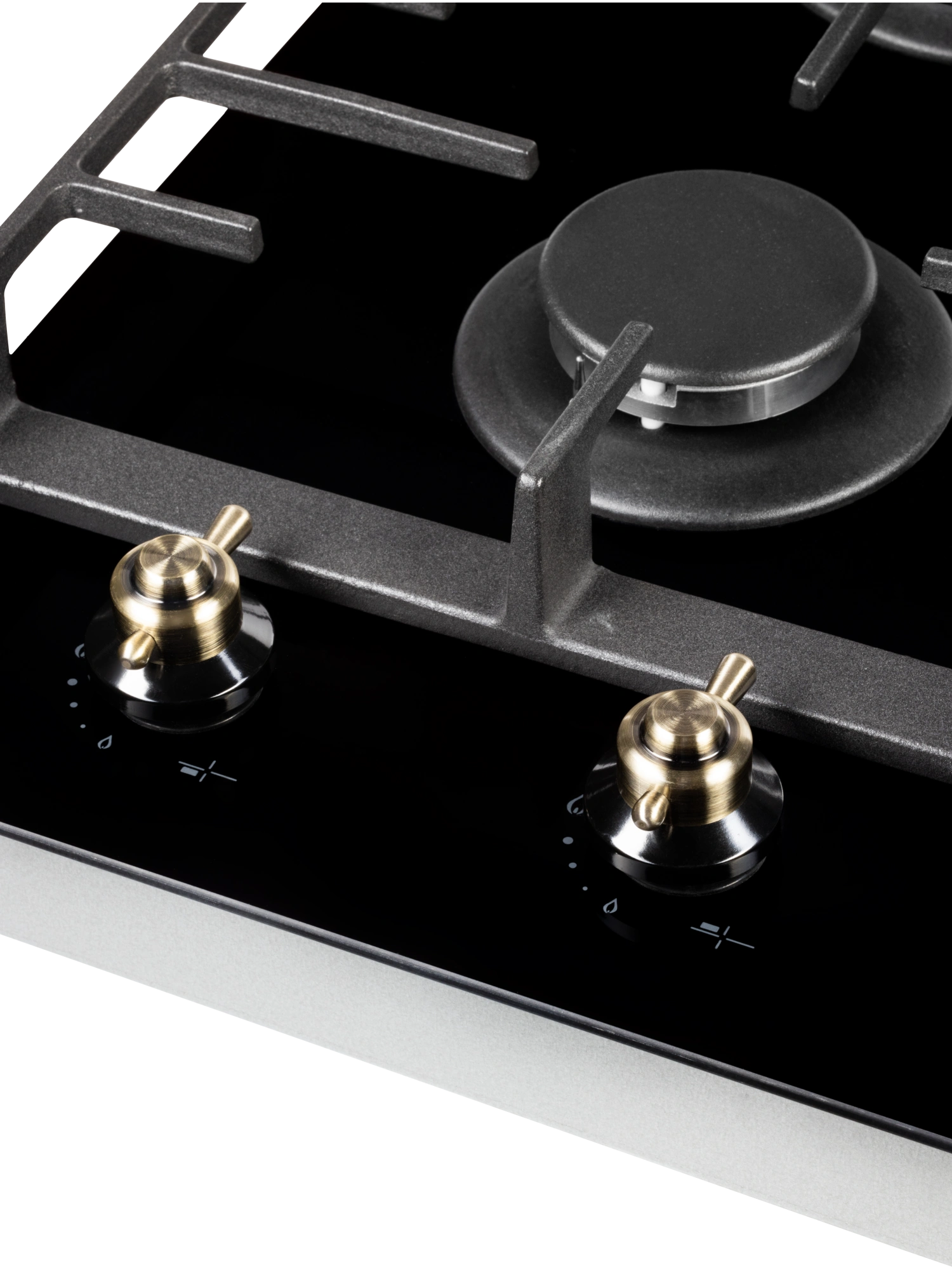 - Мощные чугунные решетки обеспечивают устойчивость посуды любой формы и веса. К технике прилагается два комплекта декоративных ручек — классические и современные, что позволяет адаптировать внешний вид панели к интерьеру кухни.