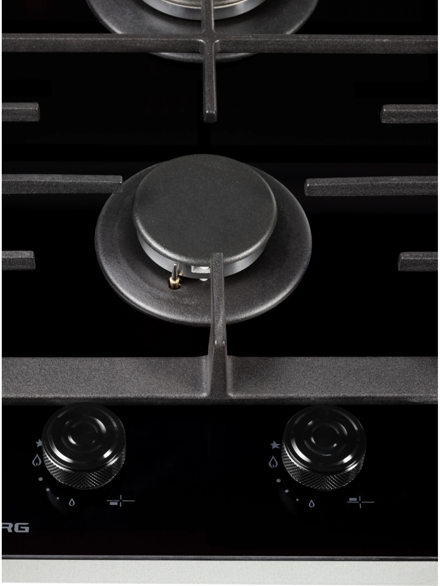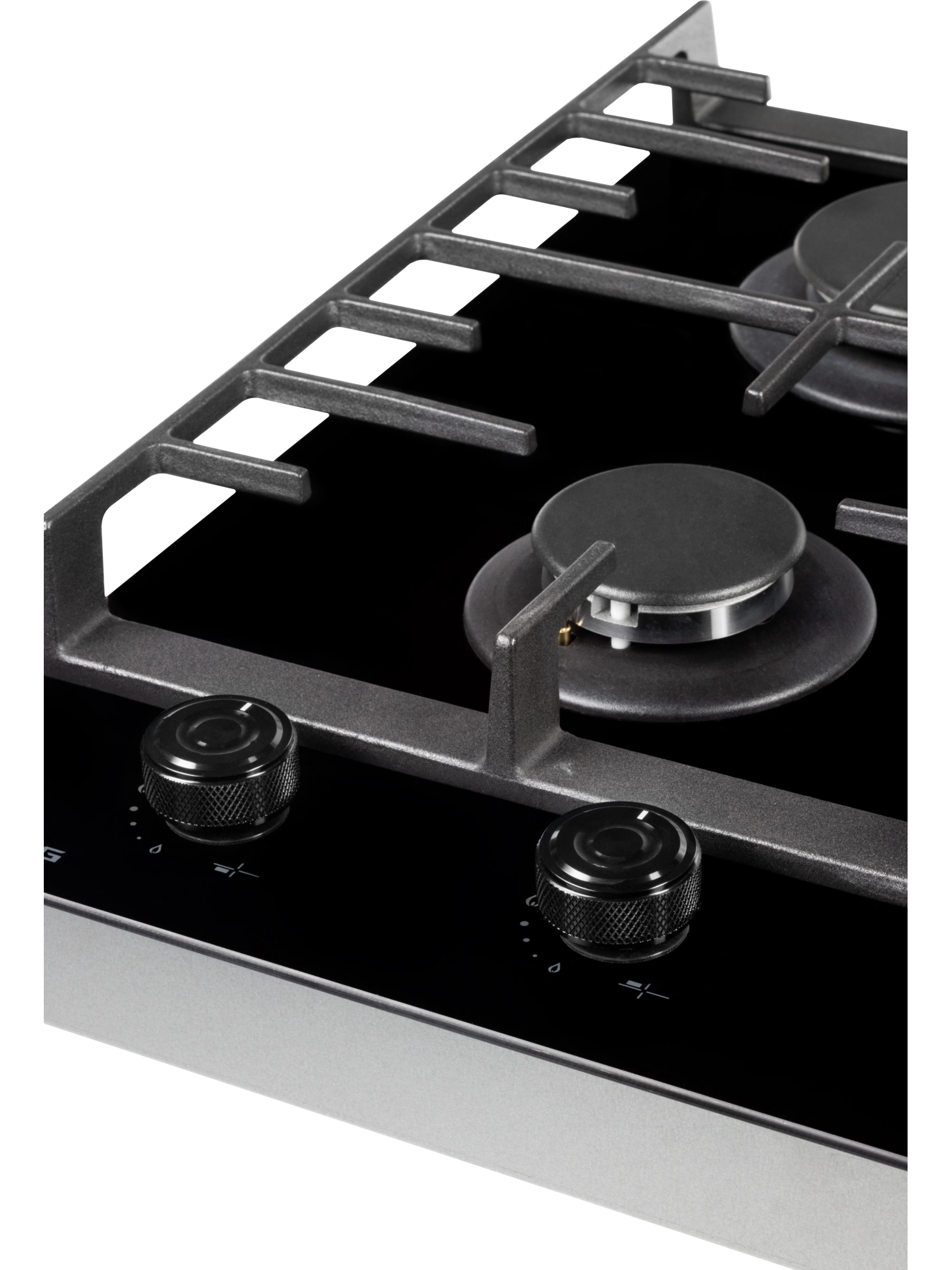 - Для приготовления на газе предусмотрены две конфорки с автоматическим электророзжигом. За безопасность отвечает система газ-контроля, перекрывающая подачу газа при затухании пламени.