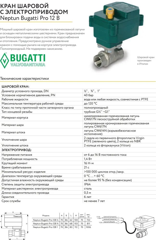Кран шаровой с электроприводом Neptun Bugatti Pro 12В 1/2 Нептун Бугатти 100035626700