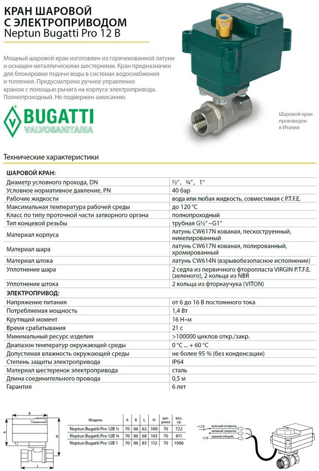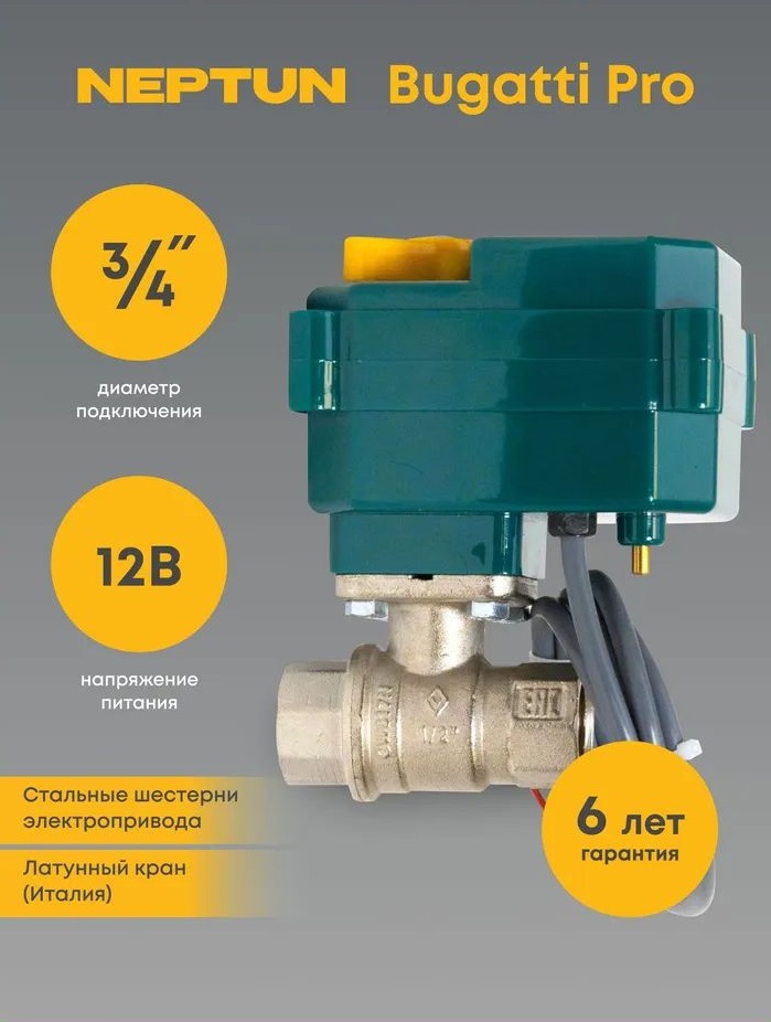 - Кран с электроприводом Neptun Bugatti Pro 12B 3/4 представляет собой компактный шаровый кран с электроприводом для перекрытия подачи воды в случае ее протечки.