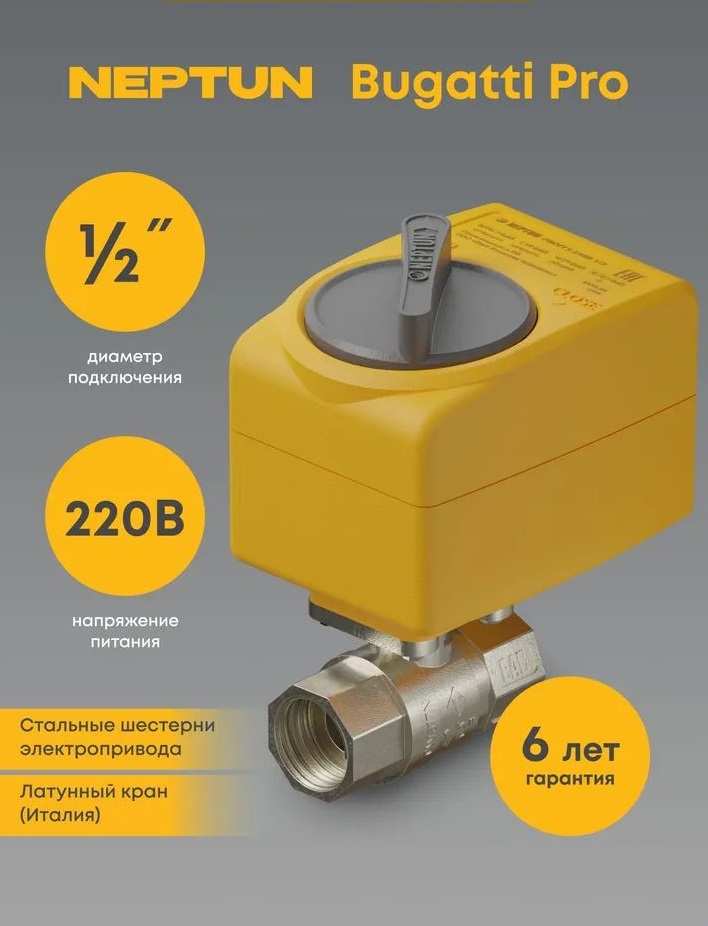- Neptun Bugatti Pro 220В ½ – полнопроходный шаровой кран, который выполнен из горячекованной латуни.