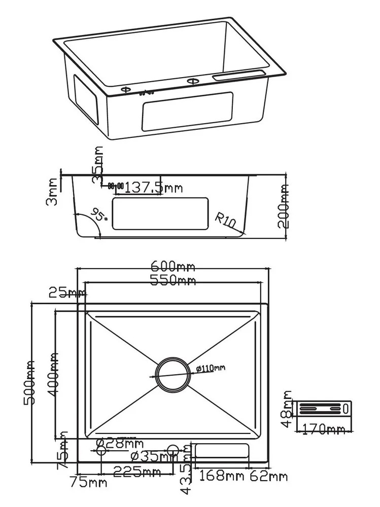 Пример: Внешний размер мойки - 800х500 мм. Размер отверстия под данную мойку 780х480 мм.