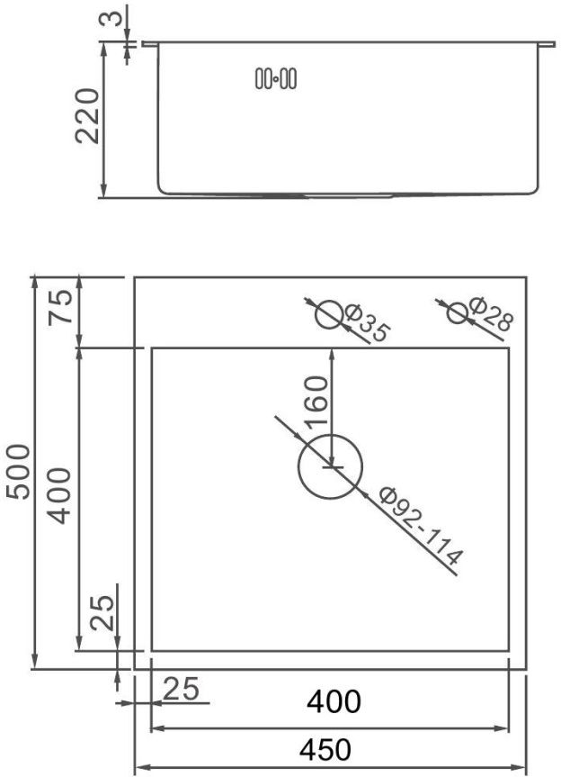 Пример: Внешний размер мойки - 800х500 мм. Размер отверстия под данную мойку 780х480 мм.