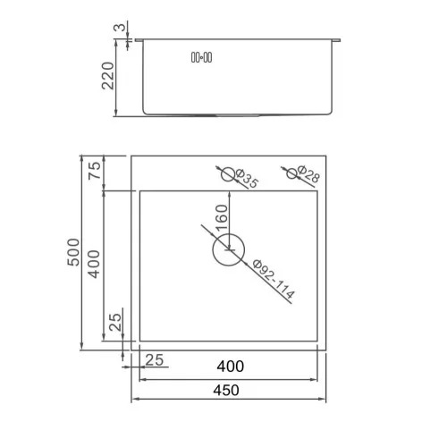 Пример: Внешний размер мойки - 800х500 мм. Размер отверстия под данную мойку 780х480 мм.
