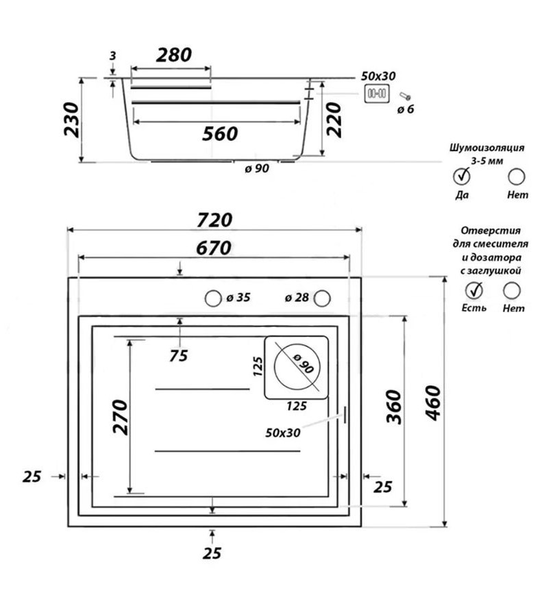 Пример: Внешний размер мойки - 800х500 мм. Размер отверстия под данную мойку 780х480 мм.