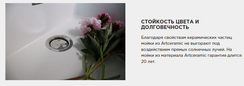 - Мойки из Artceramic не выгорают под воздействием прямых солнечных лучей благодаря свойствам керамических частиц;