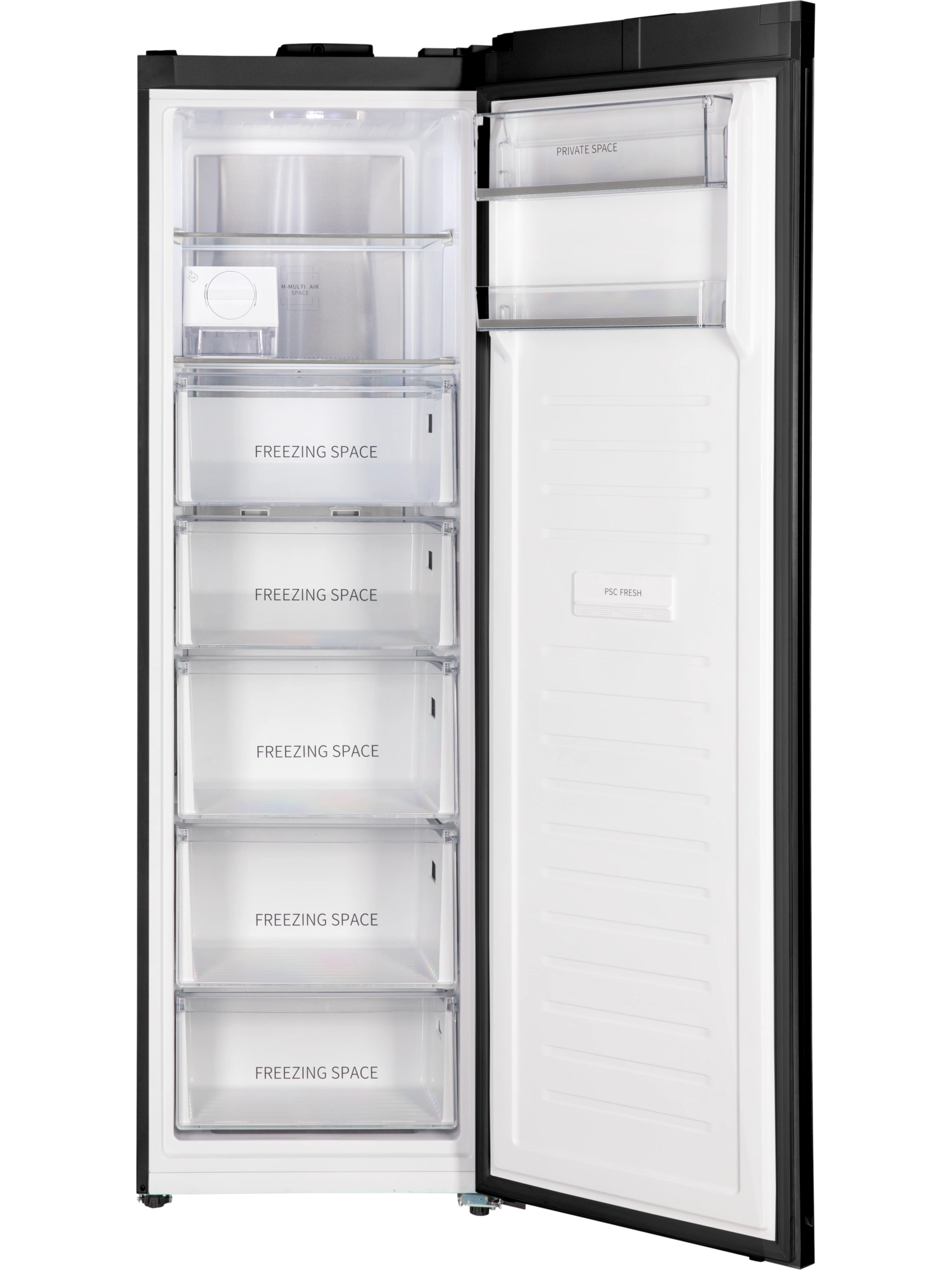 - Функция FRESH SPACE реализуется за счёт того, что на внутренней стороне двери морозильника находится блок PSC FRESH, обогащённый свободными ионами наносеребра. Он уничтожает вредные бактерии, помогает устранять запахи и надолго сохранять свежесть продуктов.