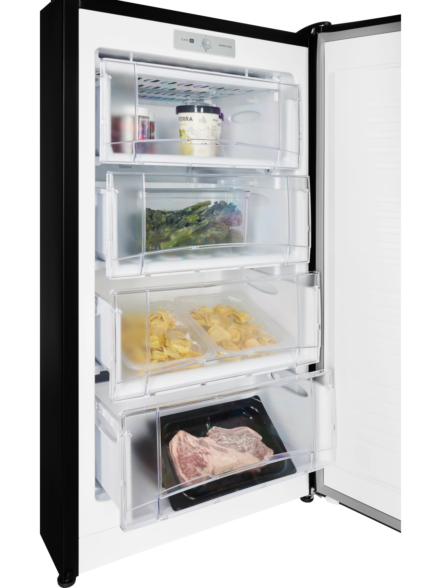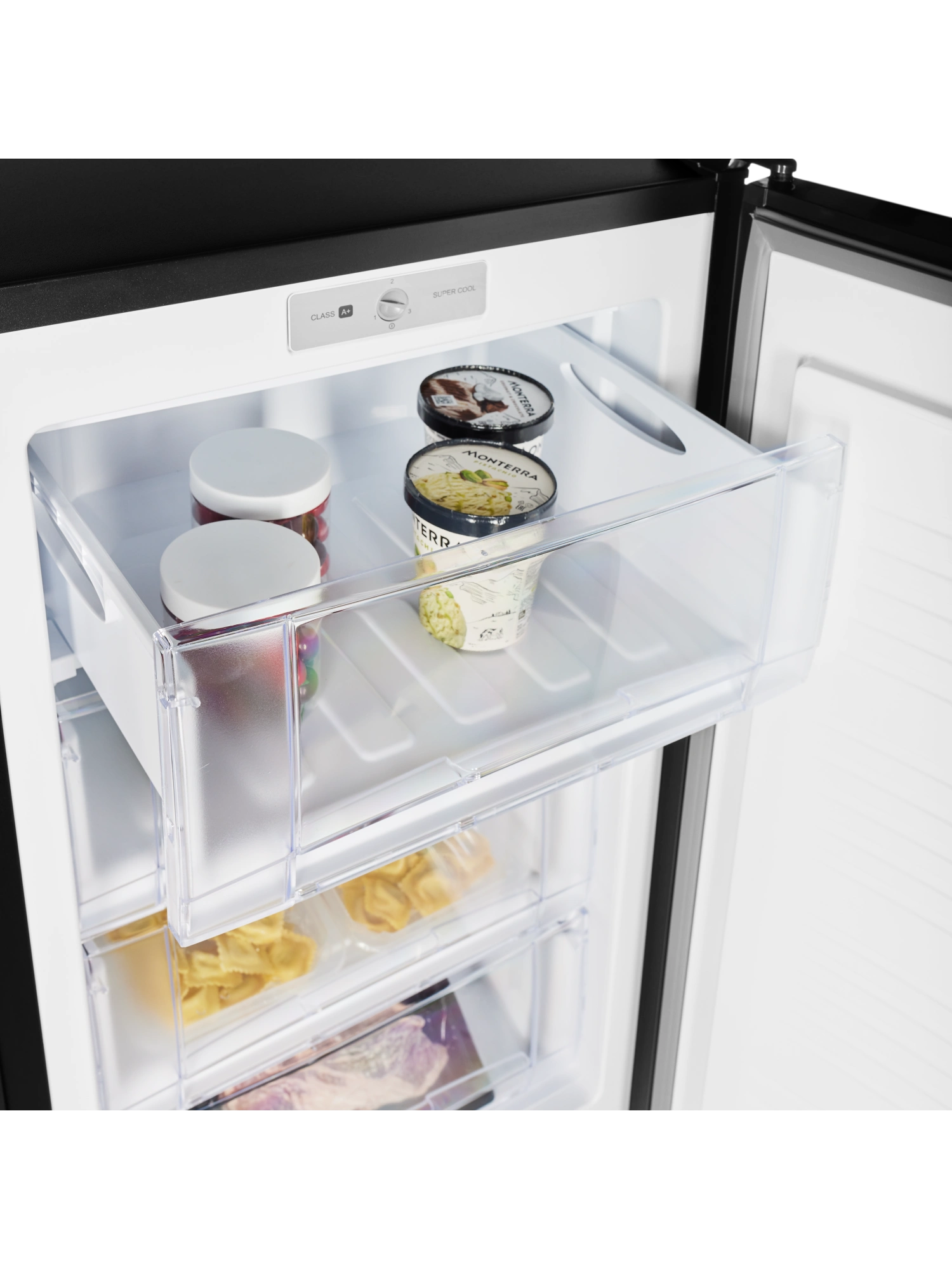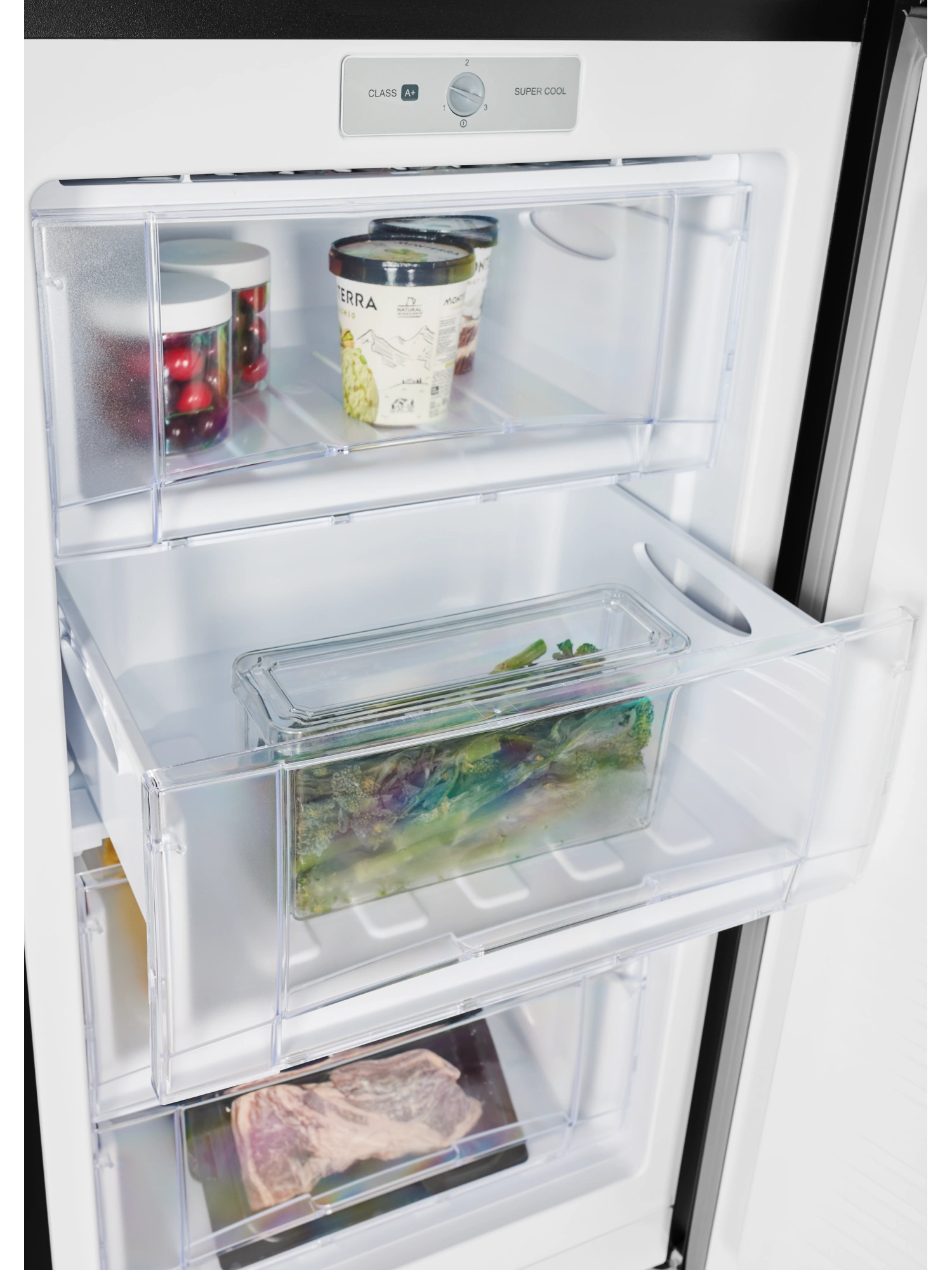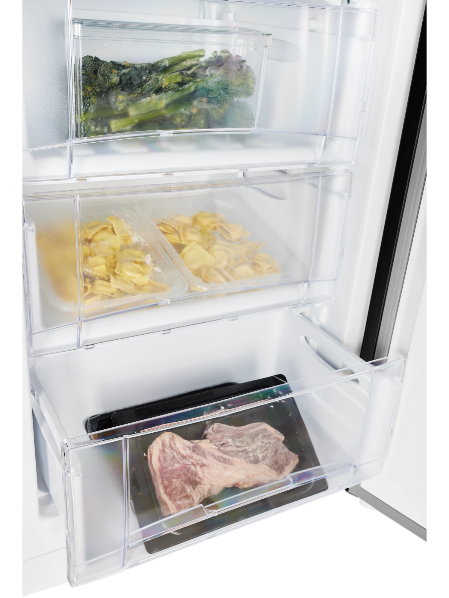 - Морозильник имеет 4 выдвижных прозрачных ящика для размещения продуктов, а также форму для льда. Внутренняя поверхность модели имеет антибактериальное покрытие, которое предотвращает появление неприятных запахов и образование бактерий.