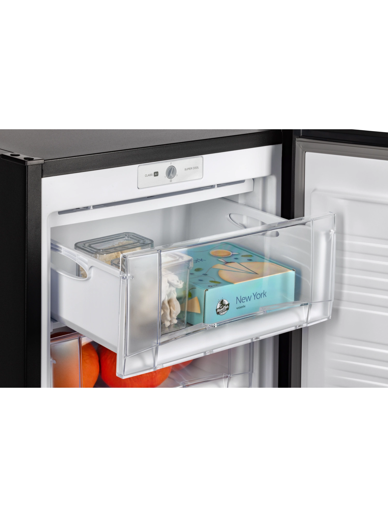- Морозильник имеет 5 выдвижных прозрачных ящиков и форму для льда. Внутренняя поверхность модели имеет антибактериальное покрытие, которое предотвращает появление неприятных запахов и образование бактерий.
