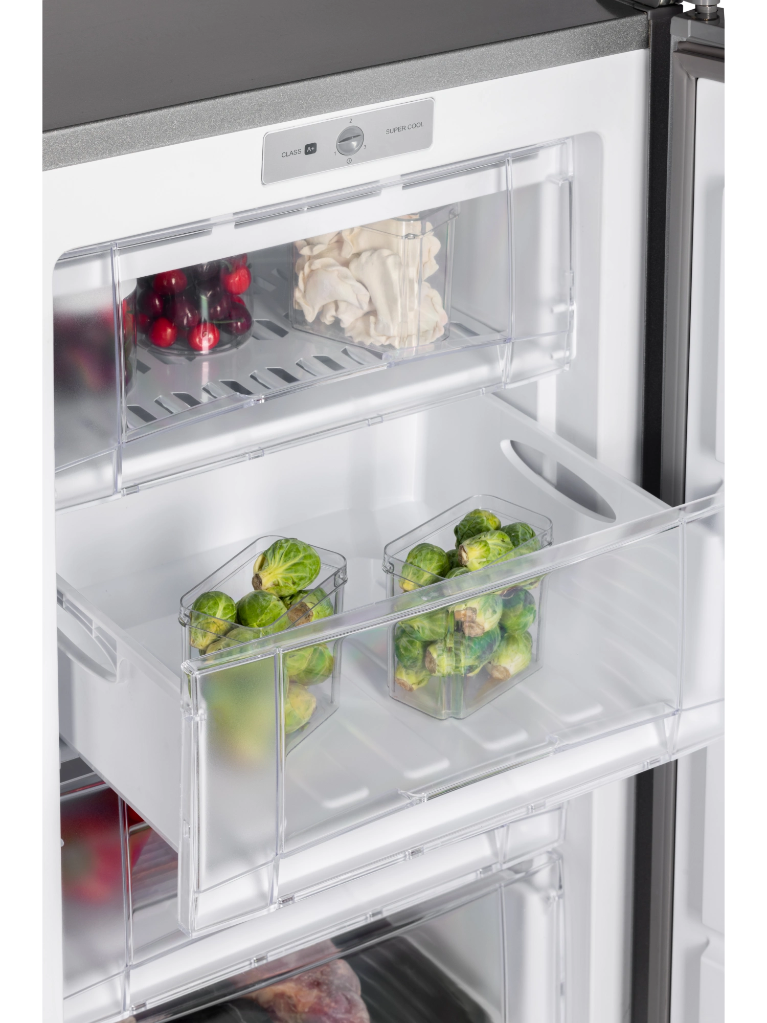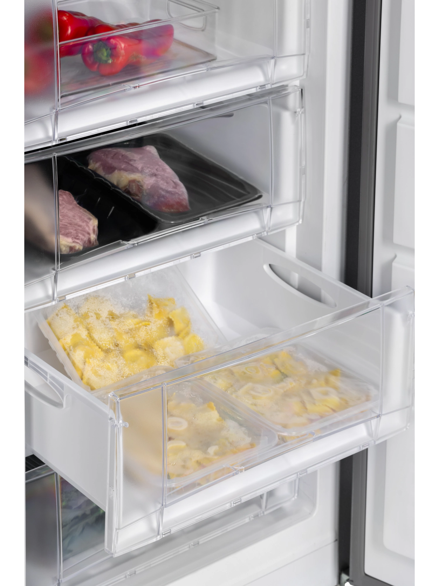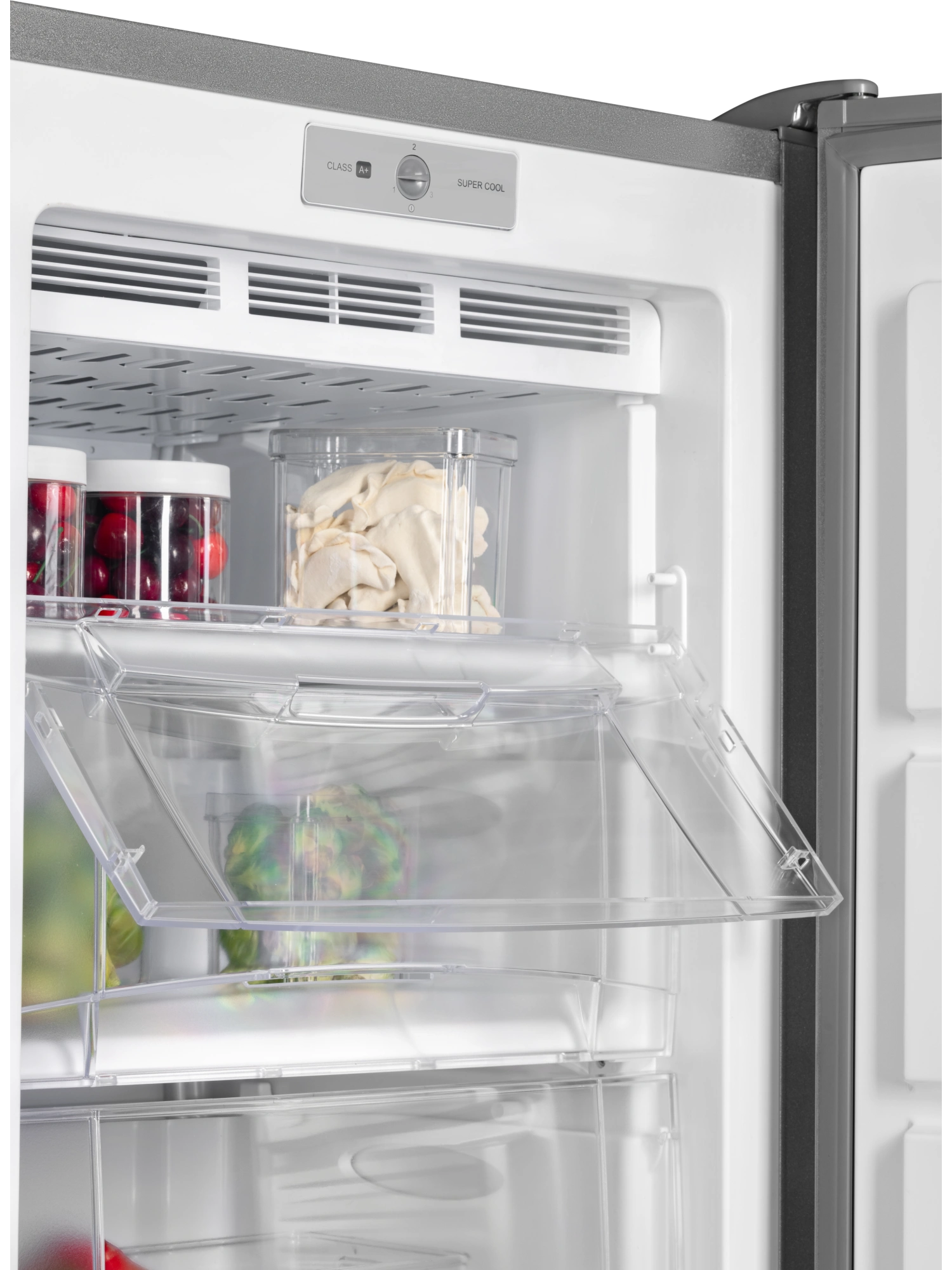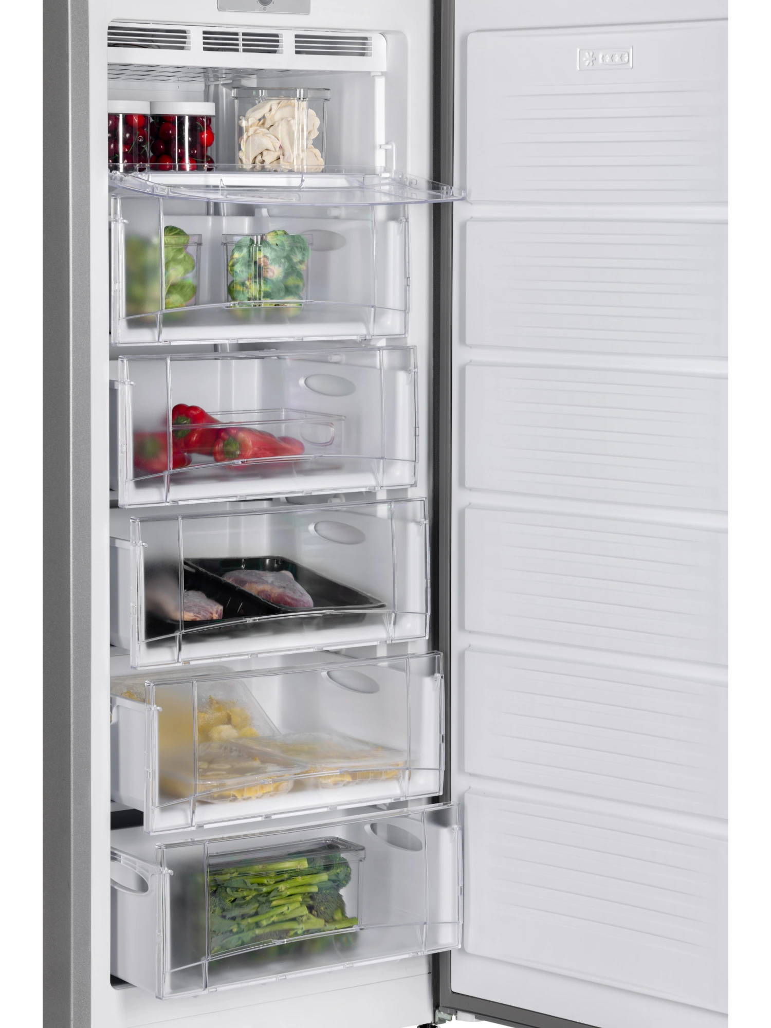 - Морозильник имеет 5 выдвижных прозрачных ящиков и 1 отделение с откидной шторкой для размещения продуктов, а также форму для льда. Внутренняя поверхность модели имеет антибактериальное покрытие, которое предотвращает появление неприятных запахов и образование бактерий.