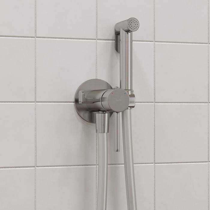 - Встраиваемый смеситель с гигиеническим душем Axes в стильном оттенке матового хрома – практичный и стильный, его дизайн сочетает в себе трендовый минимализм форм и четкие грани. Имеет крючок для полотенца, который можно установить как слева, так и справа. Гладкий душевой шланг 1,2 м в комплекте.