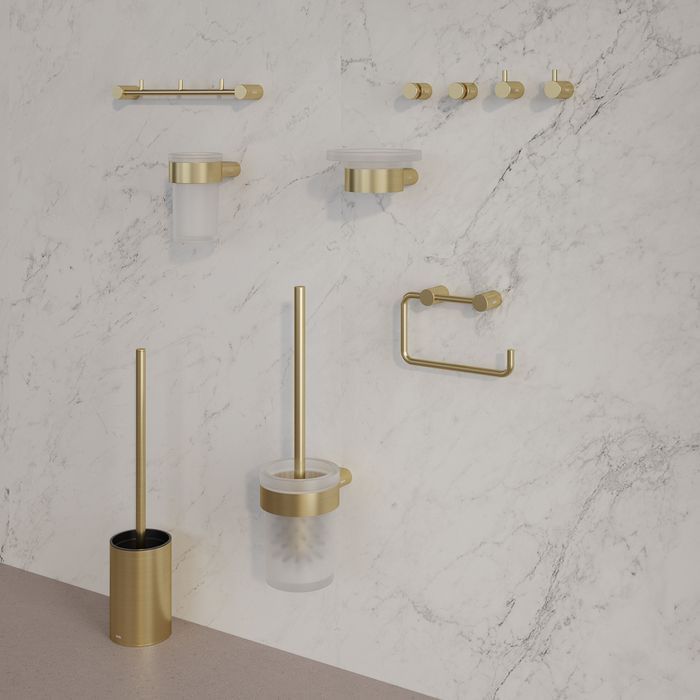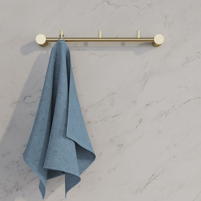 - Планка с тремя крючками Petite в матовом золотом цвете позволит с комфортом разместить несколько банных полотенец и халатов, дополнив места для хранения в ванной.