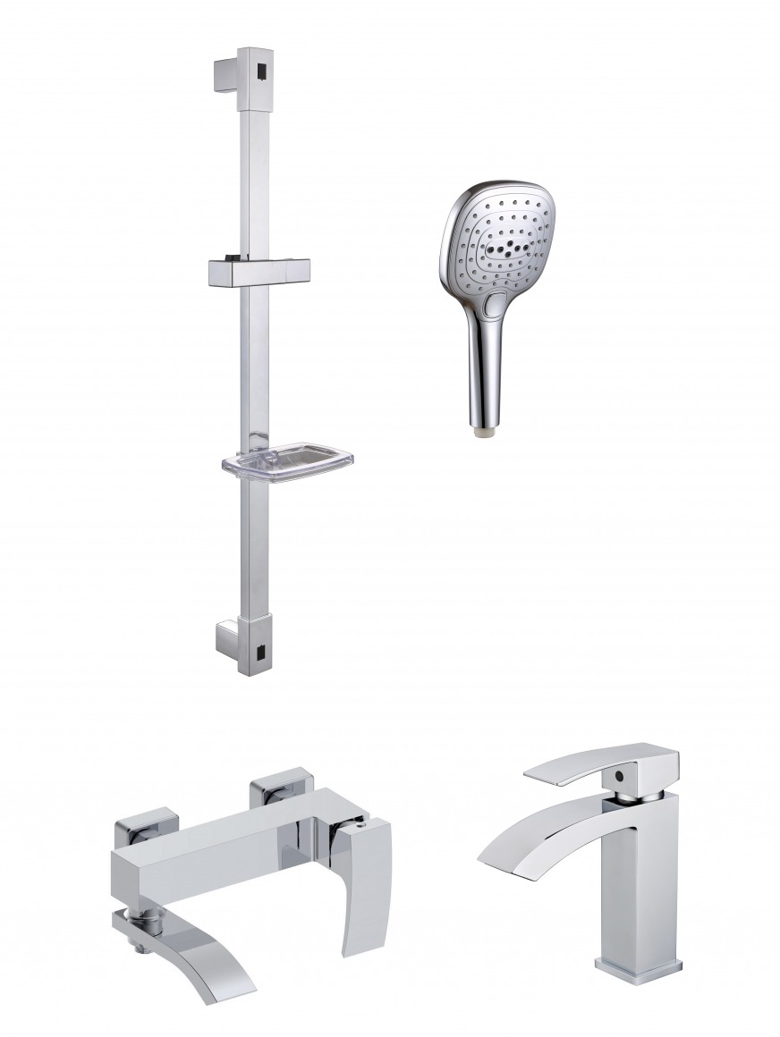 Набор смесителей 3 в 1 для ванны с коротким изливом Grocenberg GB1007CR: смеситель для раковины + смеситель для ванны с выдвижным изливом + душевой гарнитур, материал латунь, цвет хром.