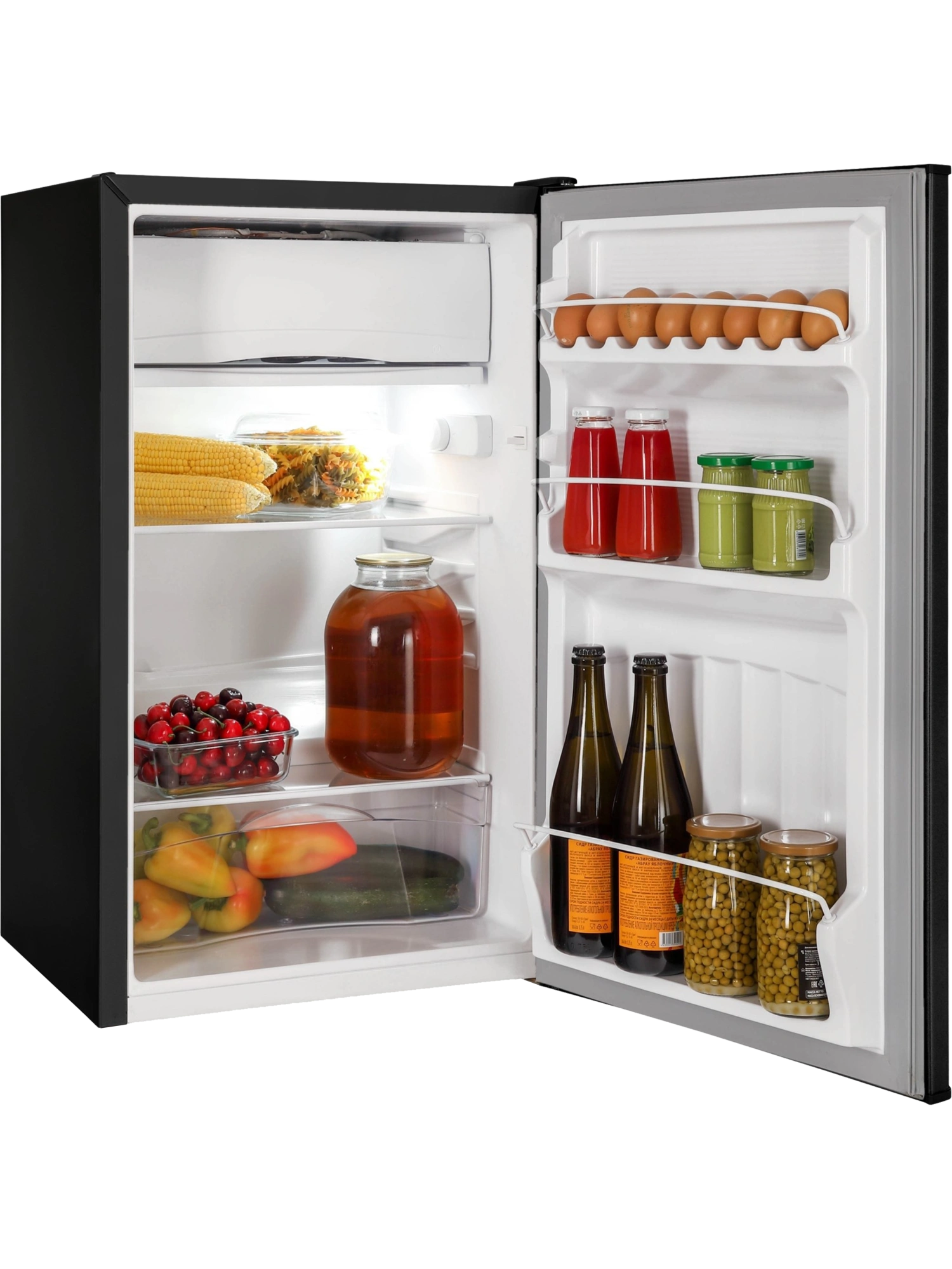 - Две полки в холодильном отделении выполнены из закаленного стекла. Небольшие полки на дверце холодильника предусмотрены для бутылок, соусов, яиц и герметичных упаковок с сырами, йогуртами.