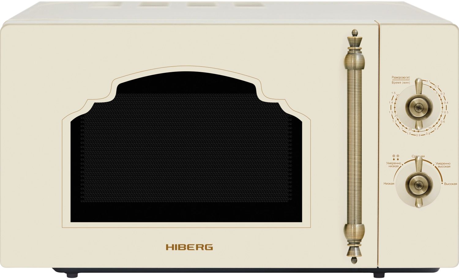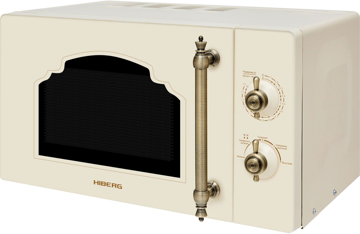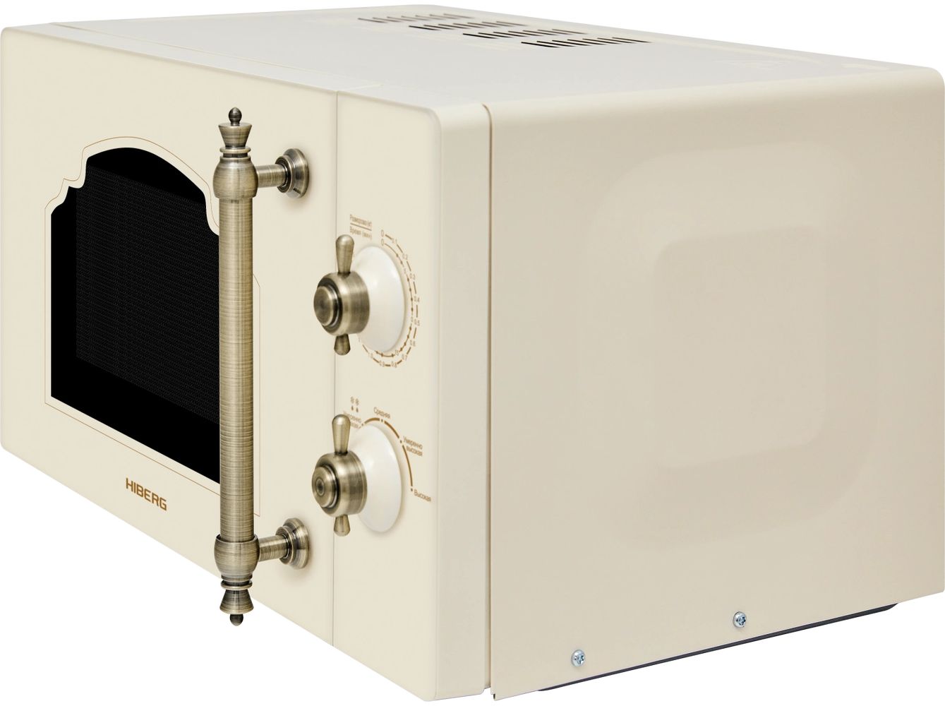 - Микроволновая печь выполнена в ретродизайне с фасадом из закаленного стекла бежевого цвета, поэтому станет органичным дополнением интерьеров кухонь в классическом стиле, кантри или прованс. Удобная металлическая ручка и стилизованные регуляторы времени и мощности на механической панели управления выполнены в цвете состаренной латуни, что выгодно подчеркивает аутентичность модели.