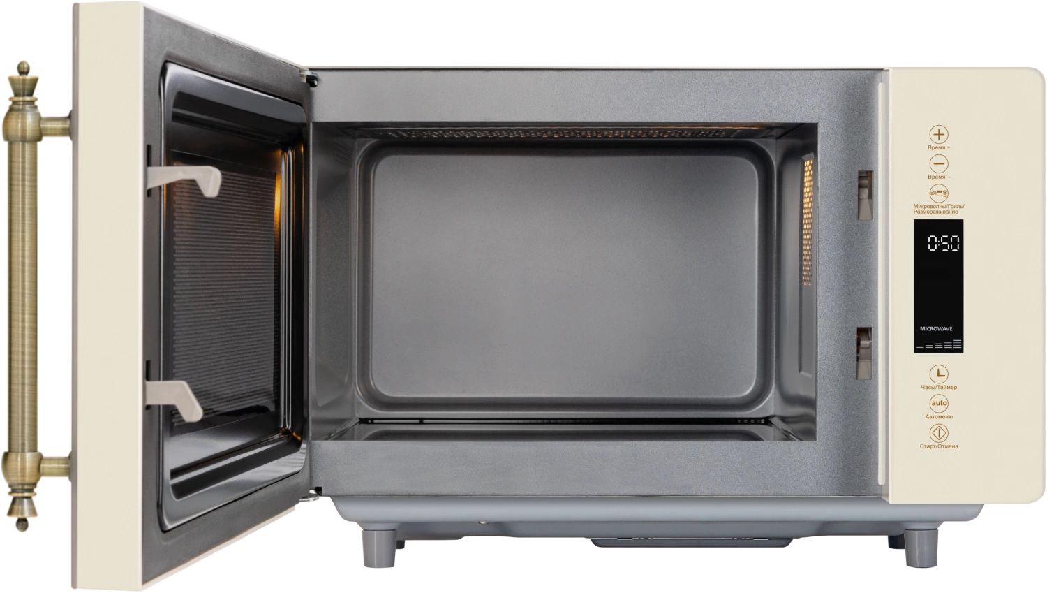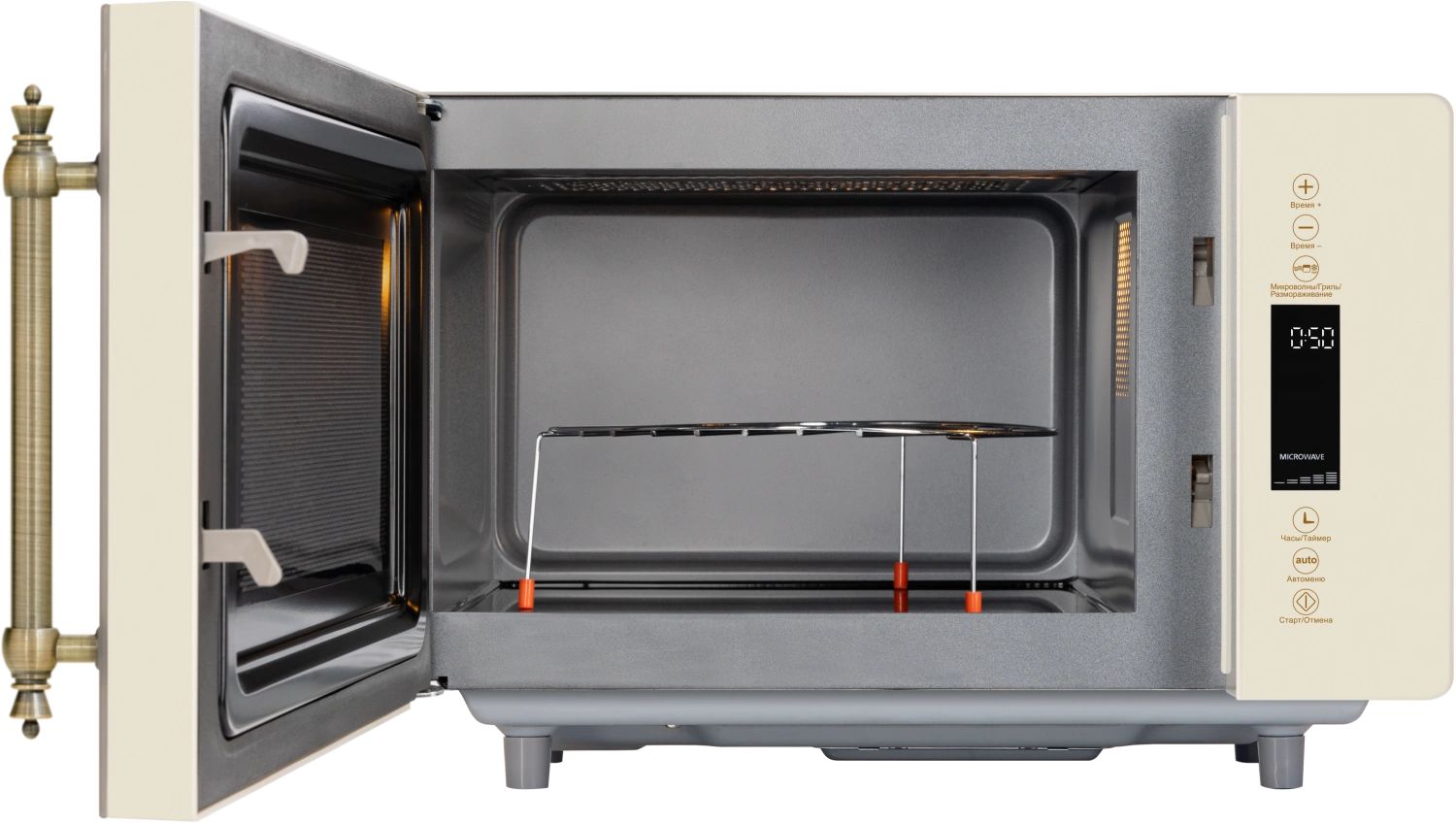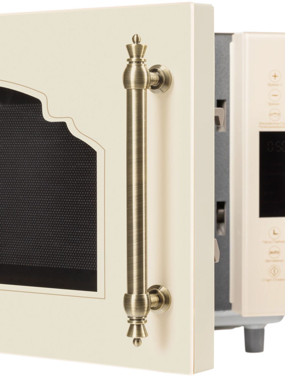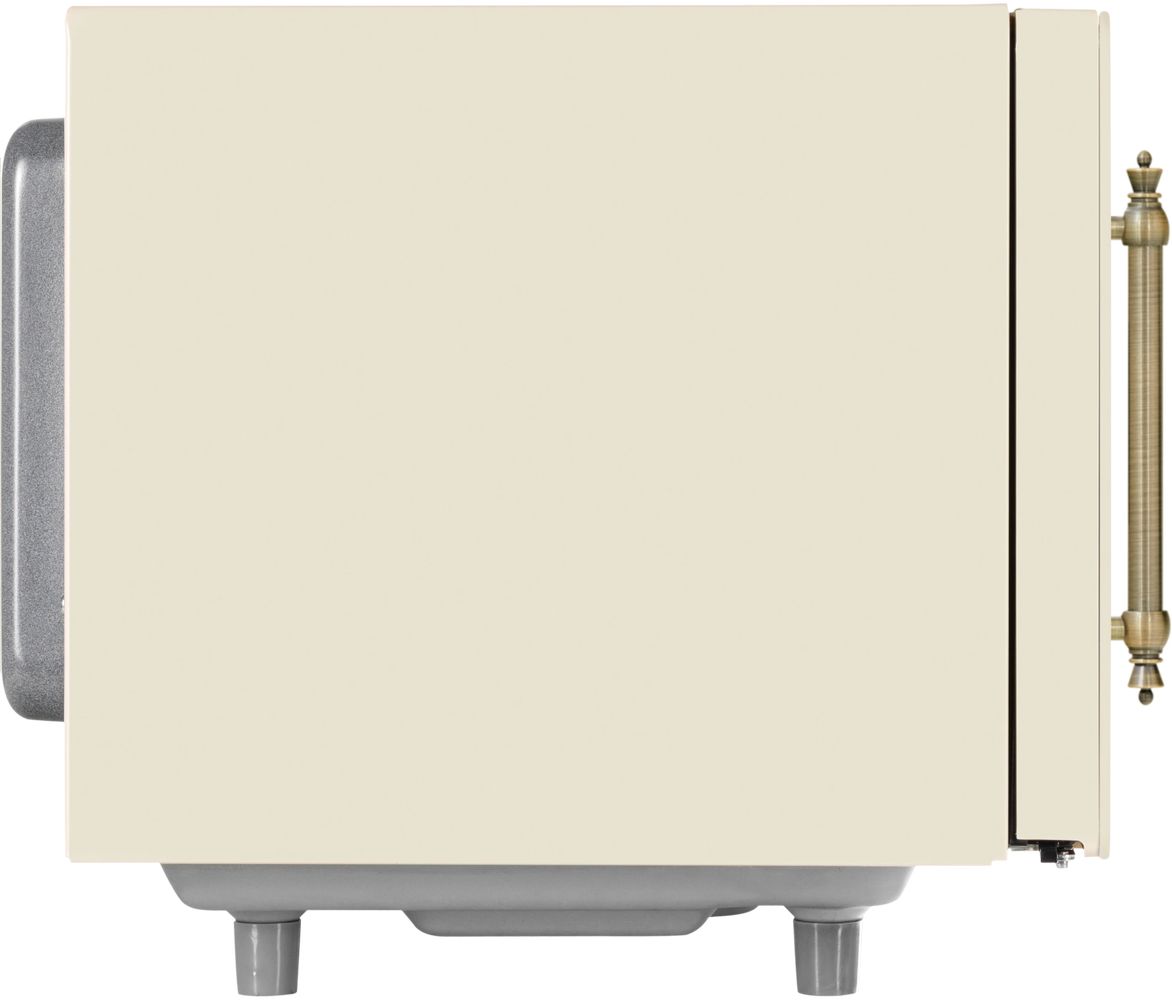 - Микроволновая печь выполнена в ретро дизайне, поэтому прекрасно впишется в интерьер кухни в классическом стиле, кантри или Прованс. Фасад микроволновой печи выполнен полностью из закаленного стекла бежевого цвета. Удобная металлическая ручка выгодно подчеркивает цвет и фактуру модели.