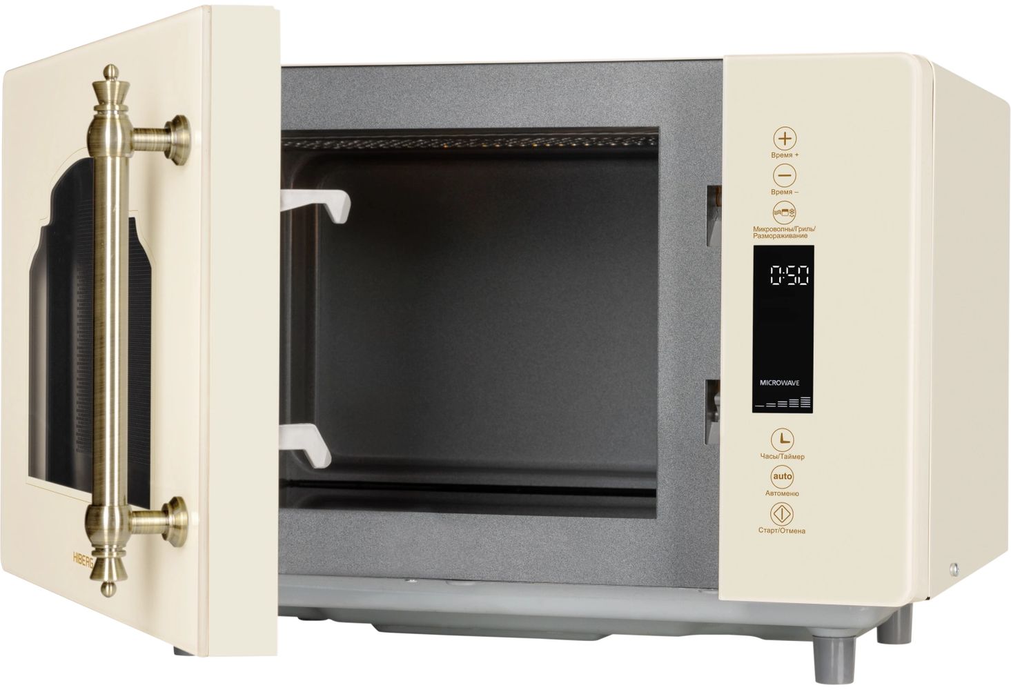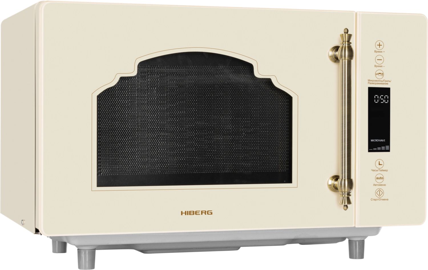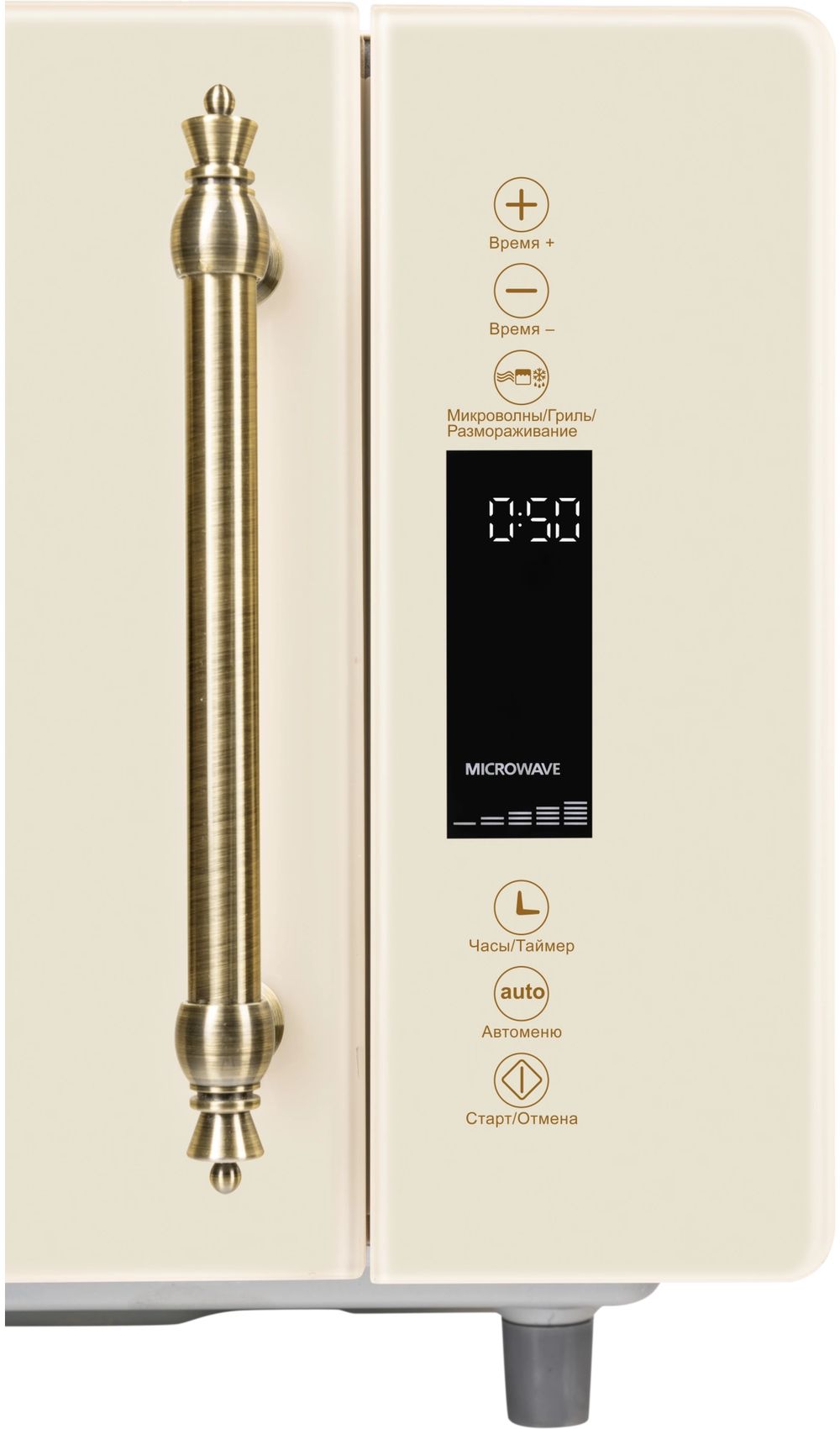 - Микроволновая печь выполнена в ретро дизайне, поэтому прекрасно впишется в интерьер кухни в классическом стиле, кантри или Прованс. Фасад микроволновой печи выполнен полностью из закаленного стекла бежевого цвета. Удобная металлическая ручка выгодно подчеркивает цвет и фактуру модели.