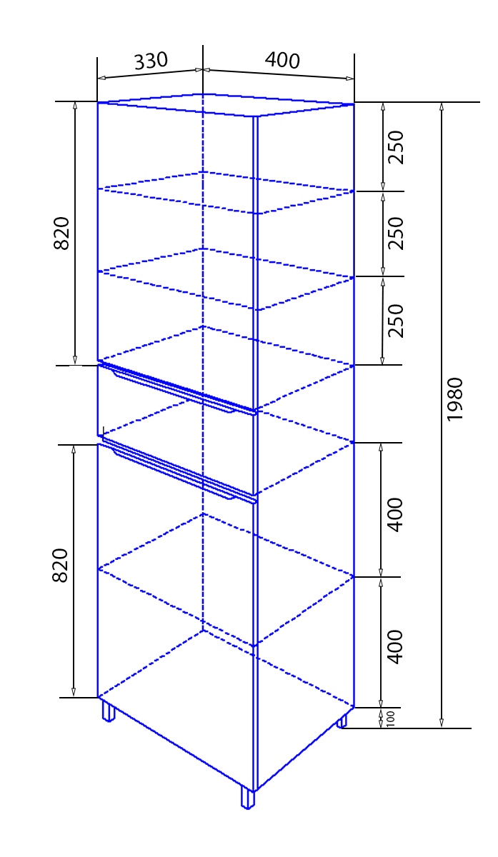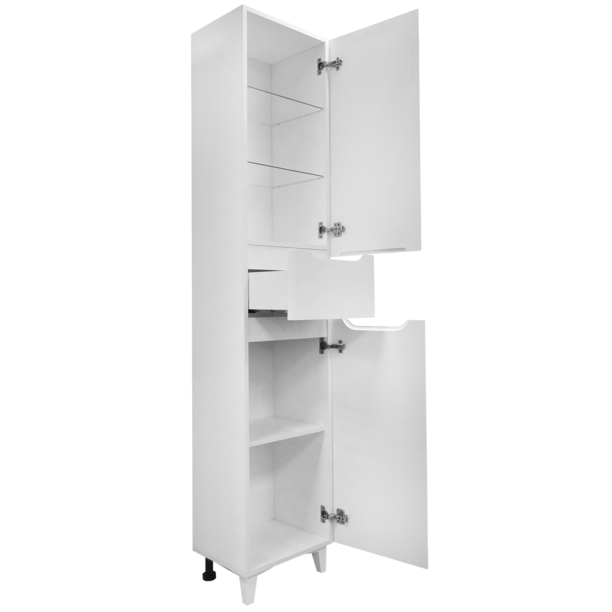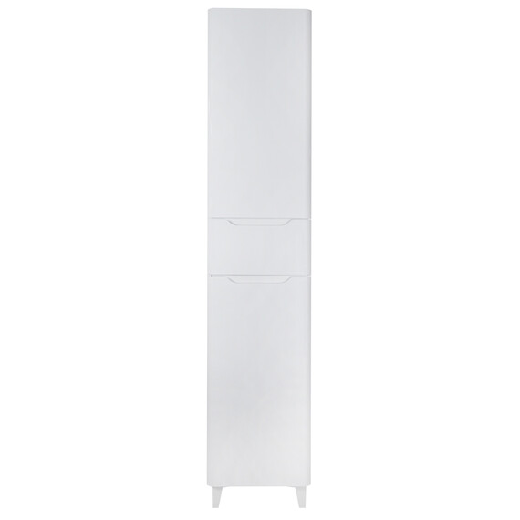 Пенал в собранном виде, с двумя распашными фасадами и одним выдвижным ящиком. Распашные фасады на доводчиках, выдвижной ящик комплектуется направляющими скрытого монтажа с доводчиками. В верхнем распашном фасаде имеется 2 стеклянные полочки, в нижнем - одна полочка из ЛДСП.