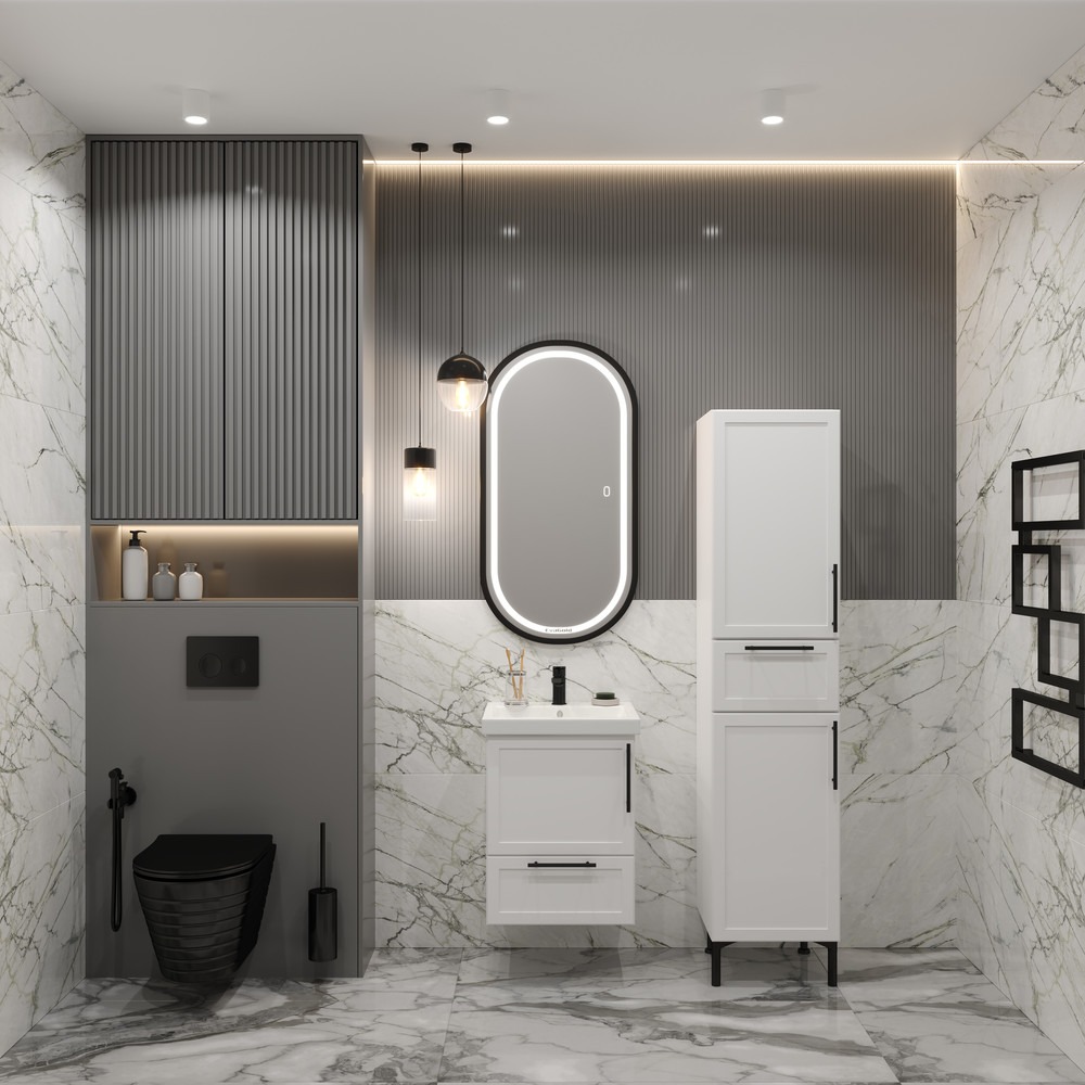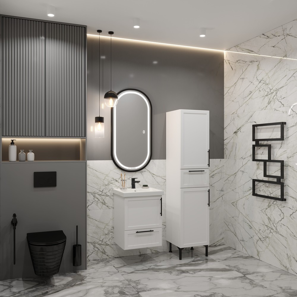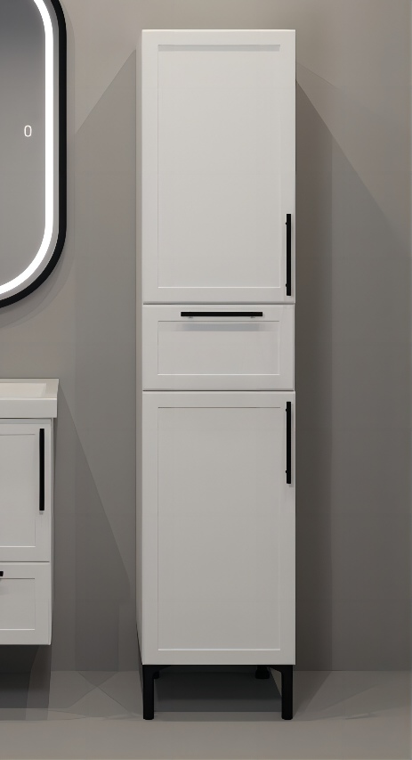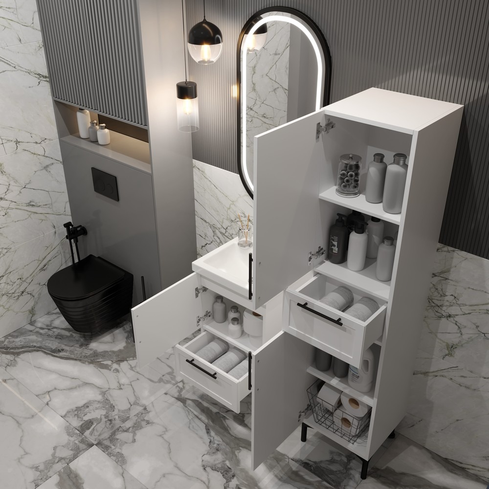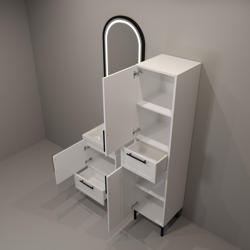 Пенал-шкаф Sofa для ванной комнаты — это элегантное и функциональное решение для хранения. Шкаф выполнен в современном стиле и имеет компактные размеры, идеально подходящие для небольших помещений. Его ширина составляет 400 мм, что позволяет ему органично вписаться в любое пространство. Корпус пенала окрашен в белый цвет с текстурой шагрень, придающей поверхности приятную матовость и устойчивость к царапинам. Внутри шкафа предусмотрен один выдвижной ящик, удобный для хранения мелочей, и четыре просторные полочки, которые обеспечивают достаточно места для хранения полотенец, косметики и других принадлежностей. Завершающий штрих — черные матовые ручки, которые подчеркивают современный дизайн и добавляют контрастность. Этот пенал-шкаф станет стильным и практичным дополнением любой ванной комнаты.