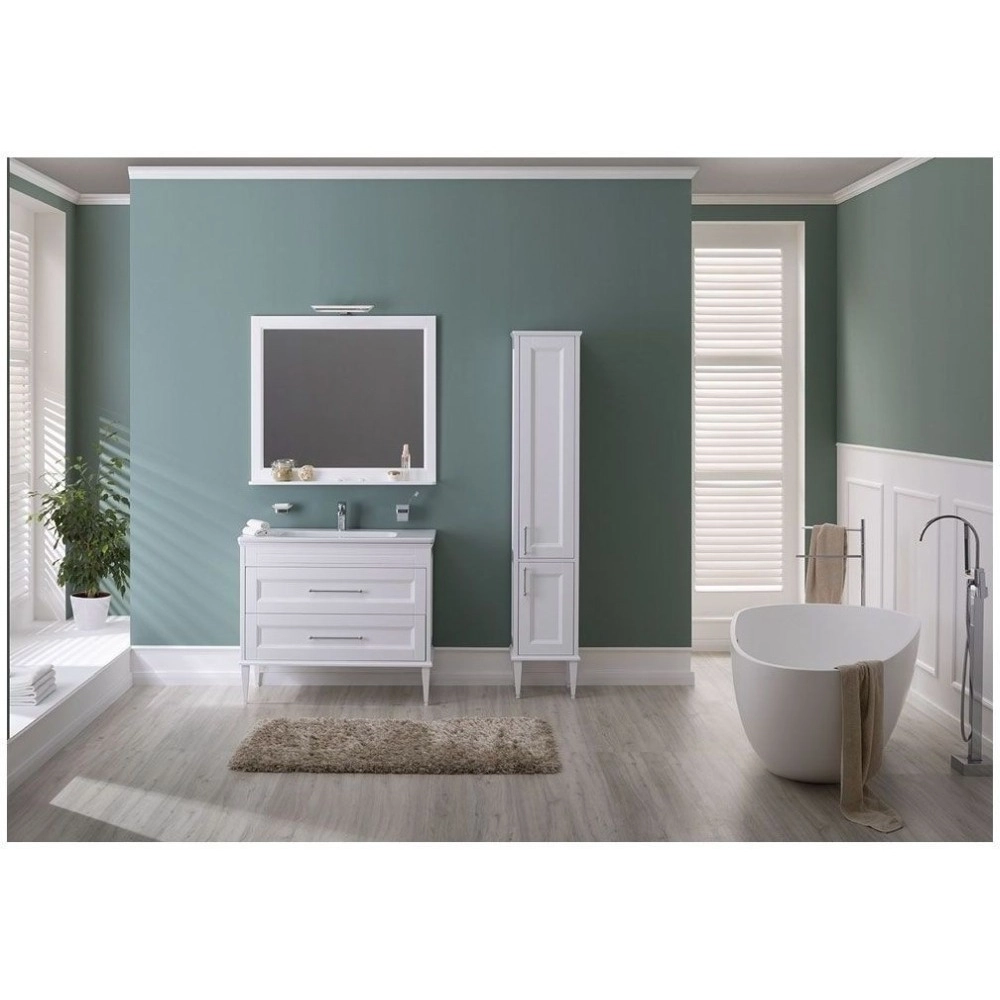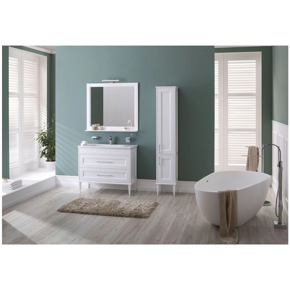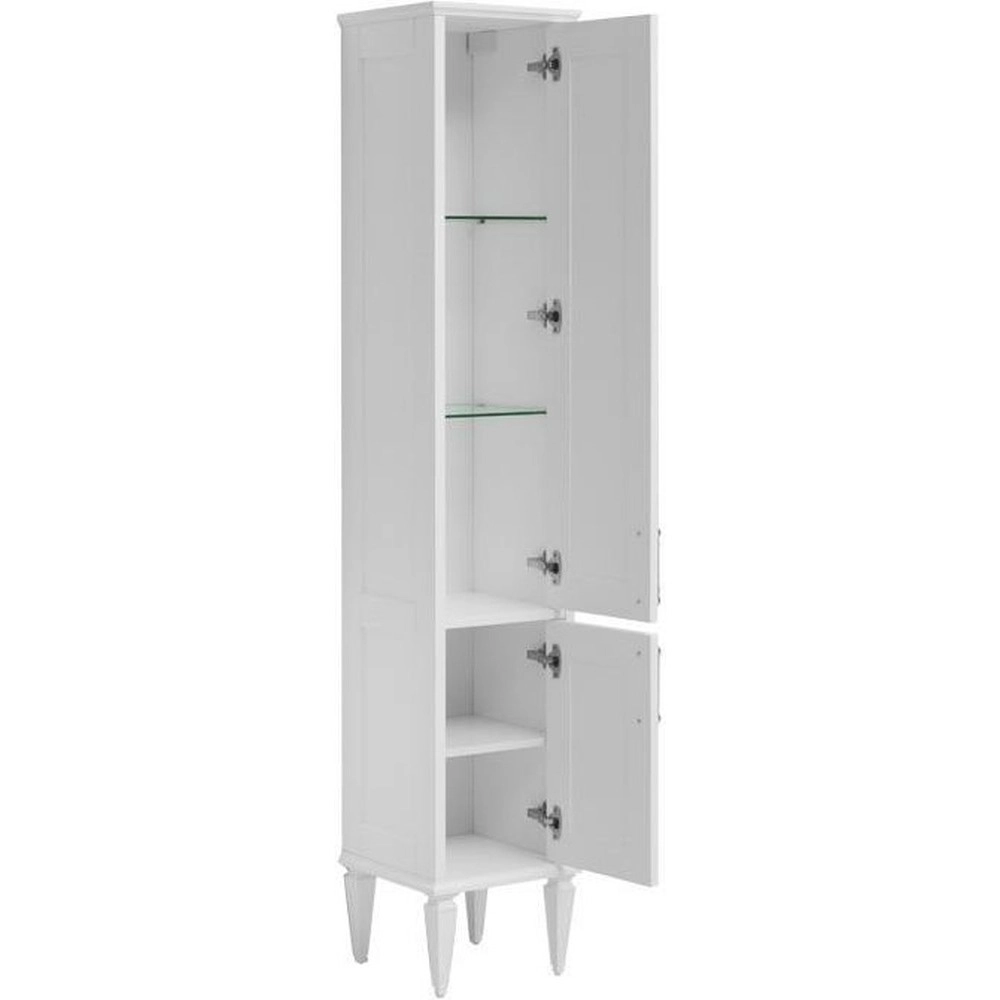 - Фрезеровка по белоснежным матовым фасадам и по боковым частям модели придает внешнему виду изделия достойный и благородный вид, свойственный классике. Но утонченные ручки, словно ниточки поблескивающие на фасадах, визуальная легкость изделия напоминает о модерне. Пенал при ширине 36 см и глубине 33 см предоставляет просторную зону хранения.