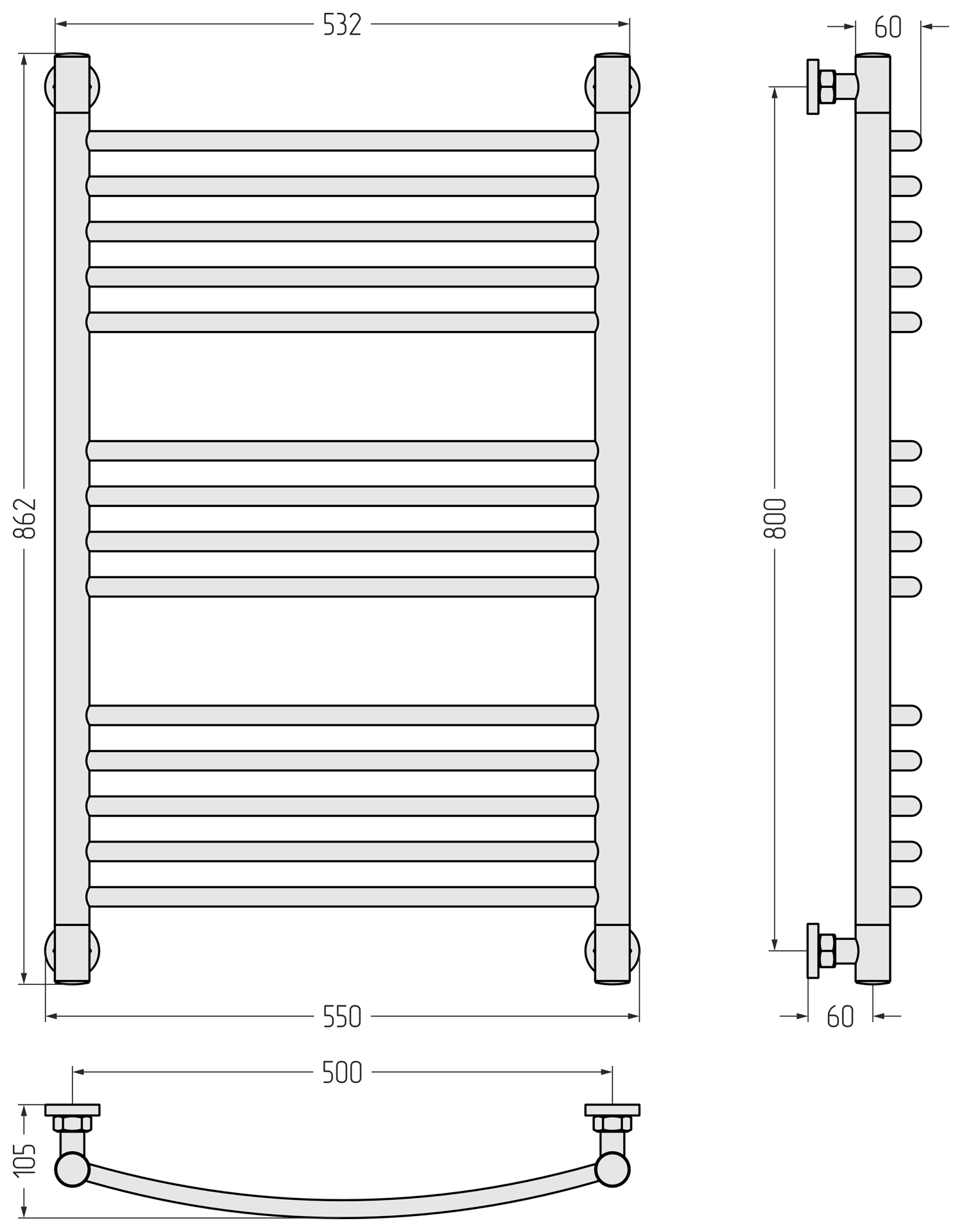 Полотенцесушитель водяной Сунержа Богема+ П14 500x860 мм (выгнутая перемычка) 071-0221-8050, сатин