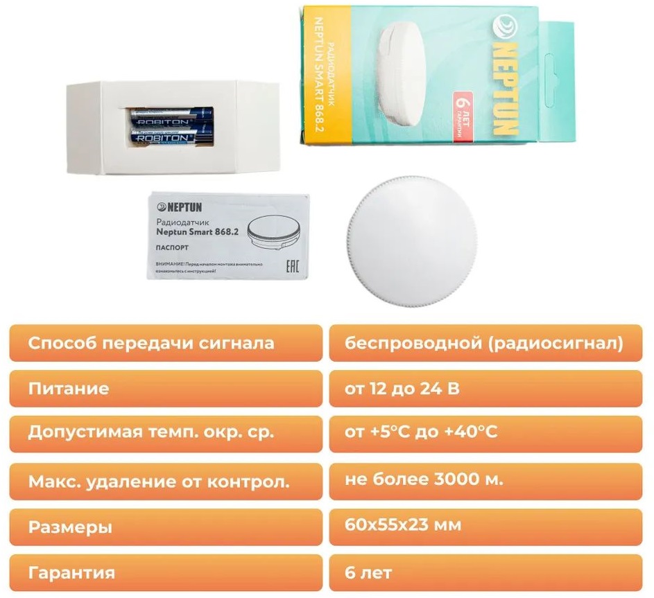 - Датчик NEPTUN Smart 868.2 предназначен для передачи сигналов на модули управления Neptun Smart/Smart+/Smart+18 в случае наличия протечки. (Важно: в модуле управления обязательно должен быть установлен "Модуль расширения Neptun Smart. Радиодатчики").