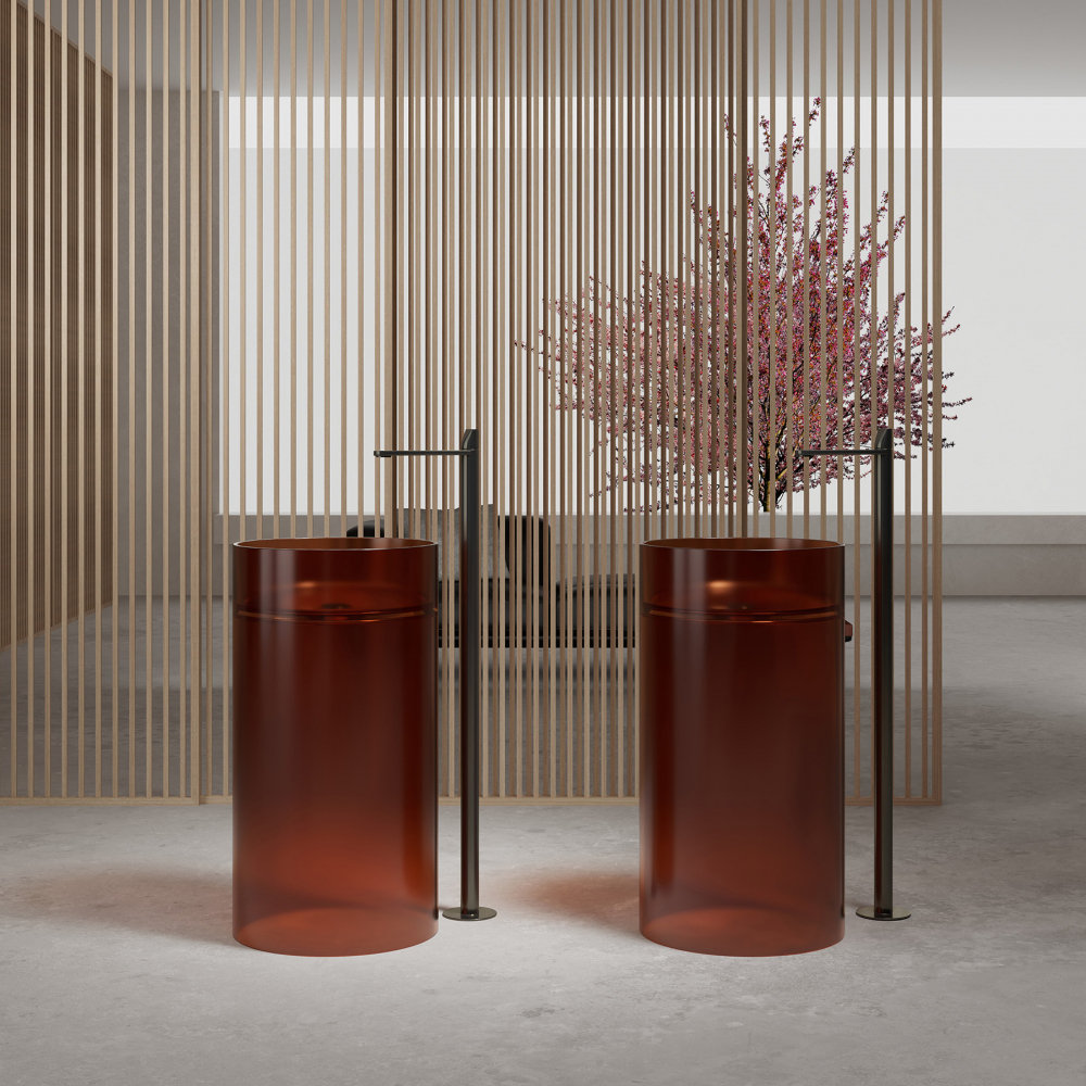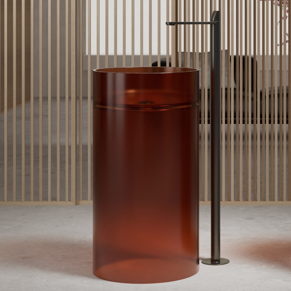 - Эта модель выделяется среди стандартной сантехники благодаря уникальному дизайну. Круглая форма добавляет пространству мягкости и гармонии, а коричневый прозрачный материал становится выразительным акцентом интерьера.
