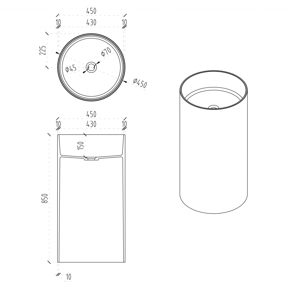 - Отдельностоящая конструкция даёт свободу в размещении: раковину можно установить как в центре ванной комнаты, так и у стены. Это позволяет гибко планировать пространство и создавать выразительный визуальный центр интерьера.