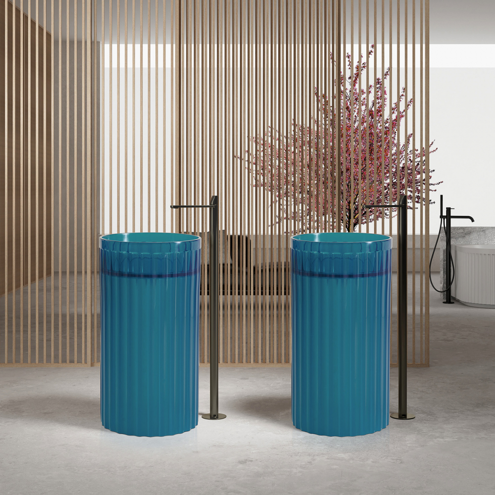 - Особенность раковины — в удивительной способности играть со светом. Полупрозрачный материал мягко рассеивает световые потоки, создавая эффект глубины и объёма. Бирюзовый оттенок придаёт пространству свежесть и лёгкость, визуально расширяя границы ванной комнаты. Круглая форма добавляет композиции гармоничности и завершённости.