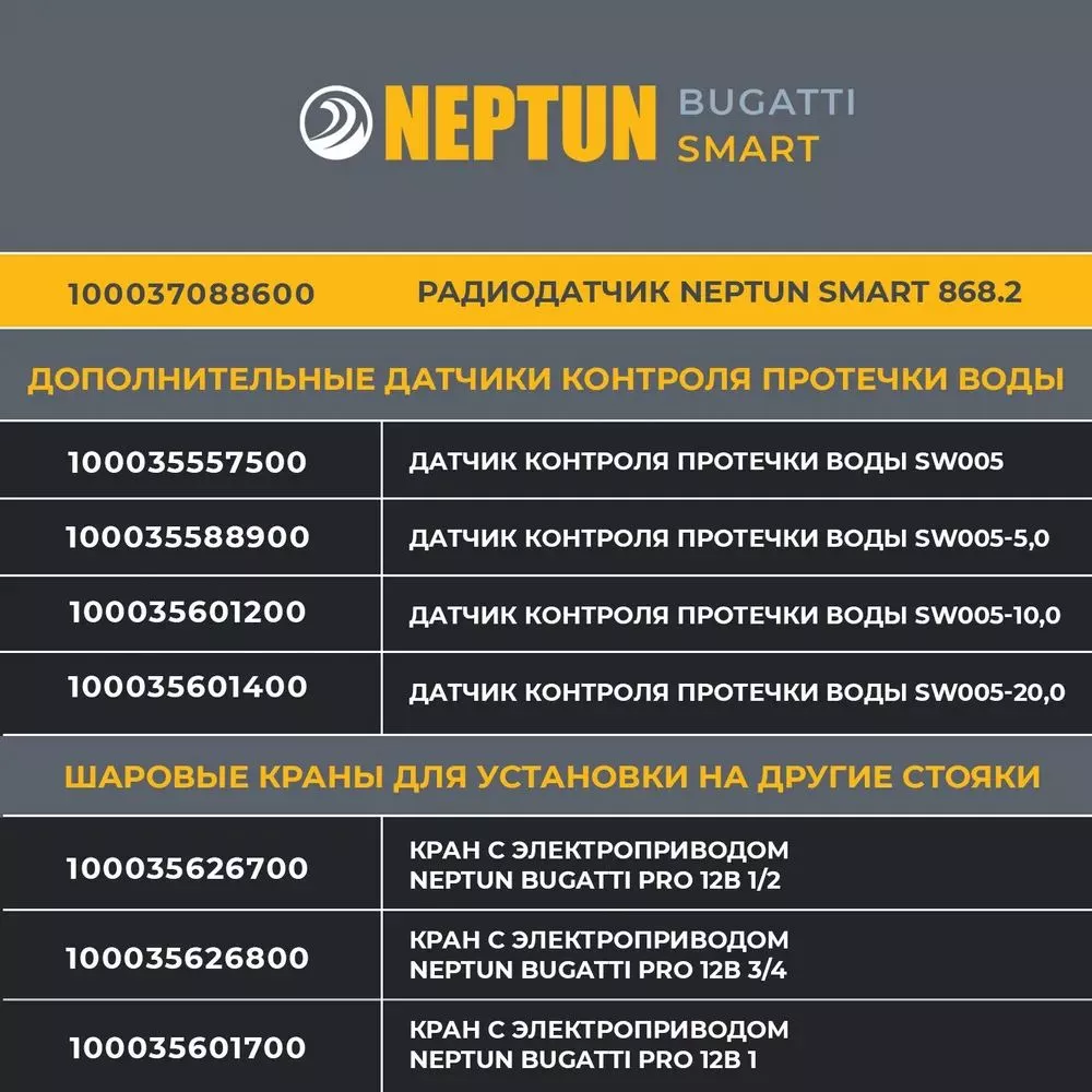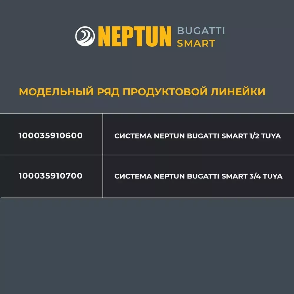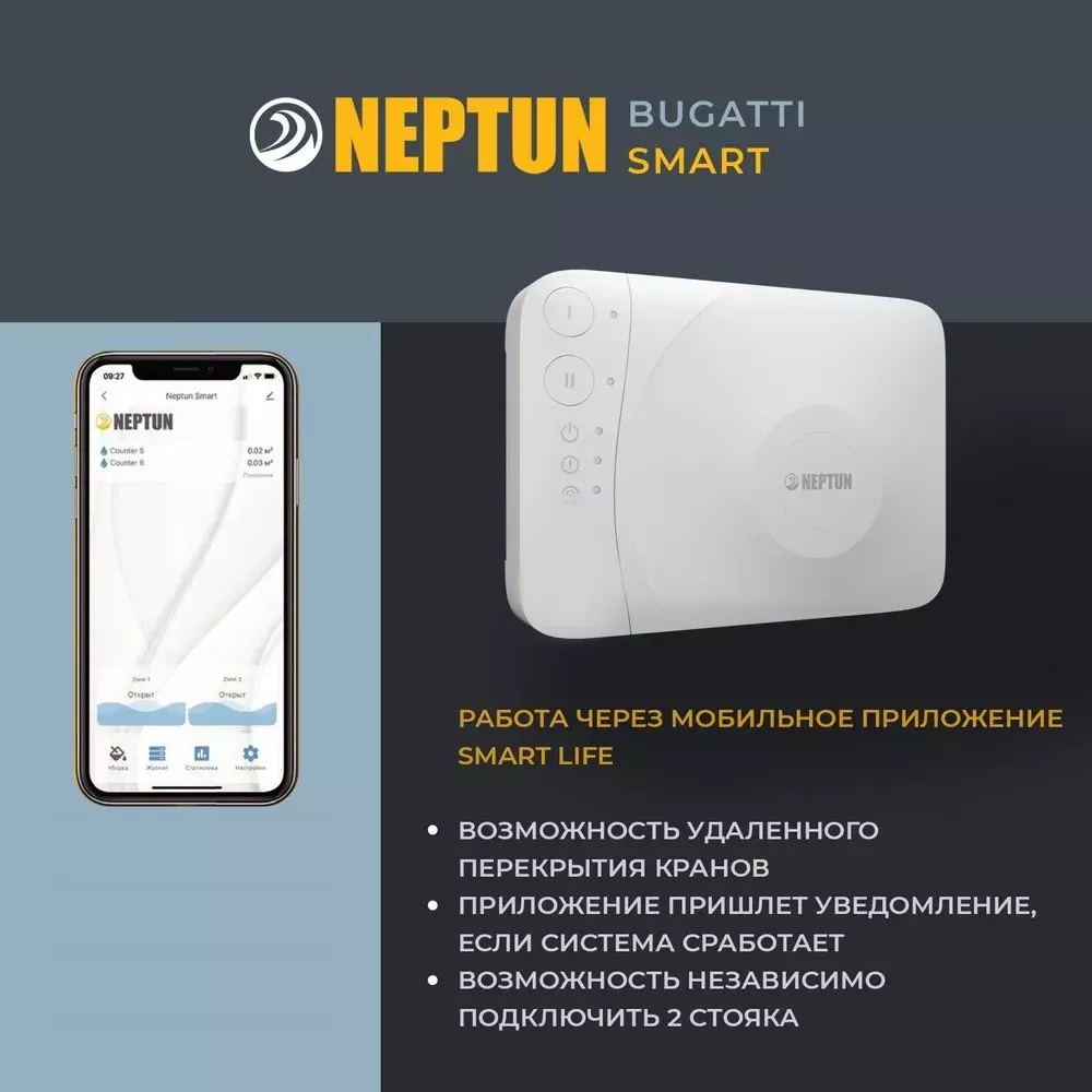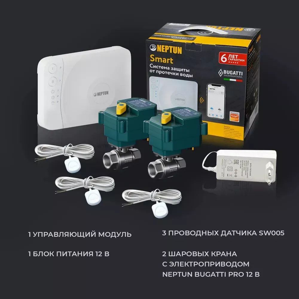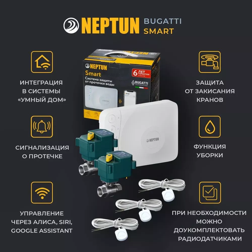 - Умная система защиты от протечки воды Neptun Bugatti Smart Tuya предназначена для обнаружения и локализации протечек воды в системах водоснабжения. Компоненты системы связаны и взаимодействуют друг с другом через центральный контроллер (модуль управления Neptun Smart Tuya), который может быть дополнительно укомплектован дополнительными платами расширения: