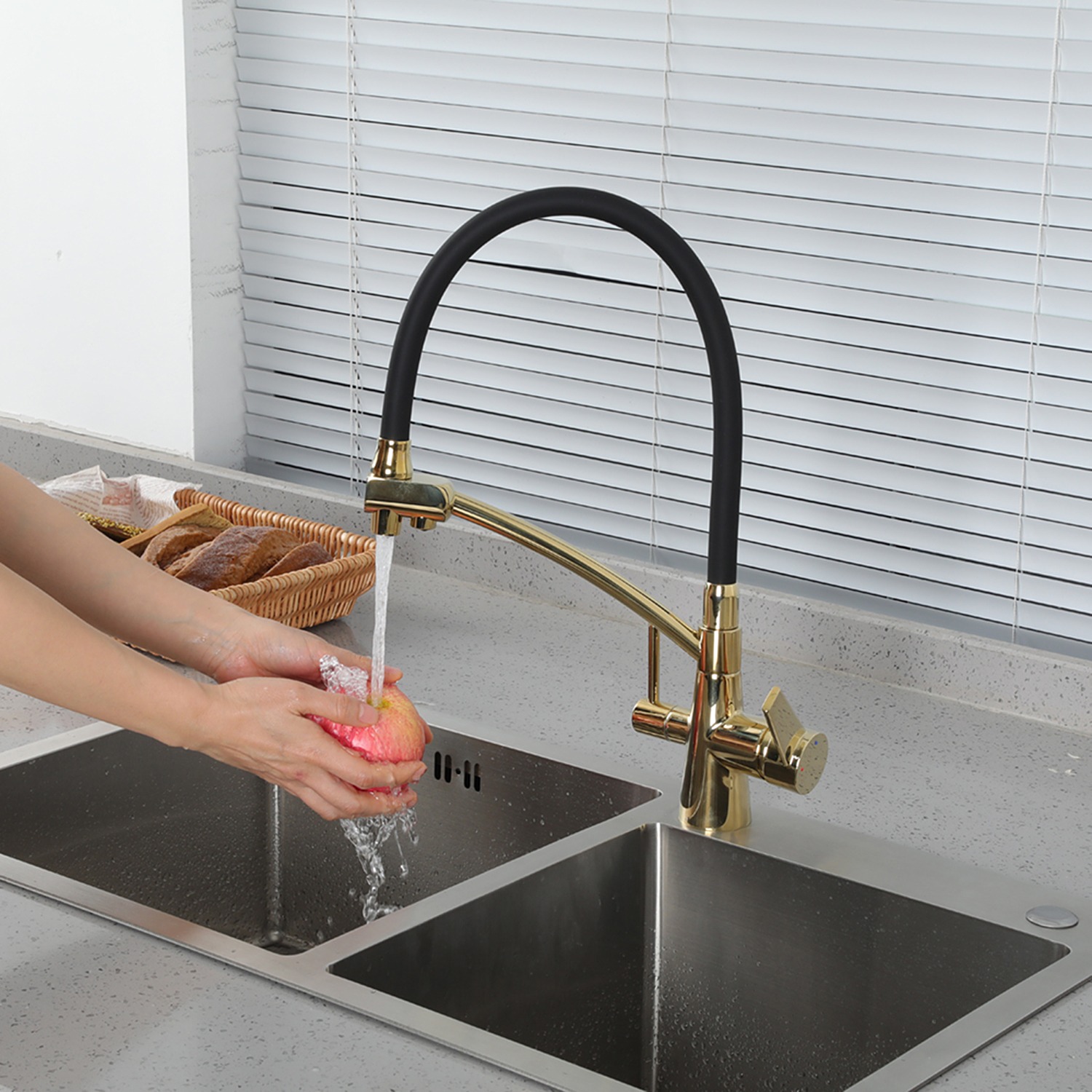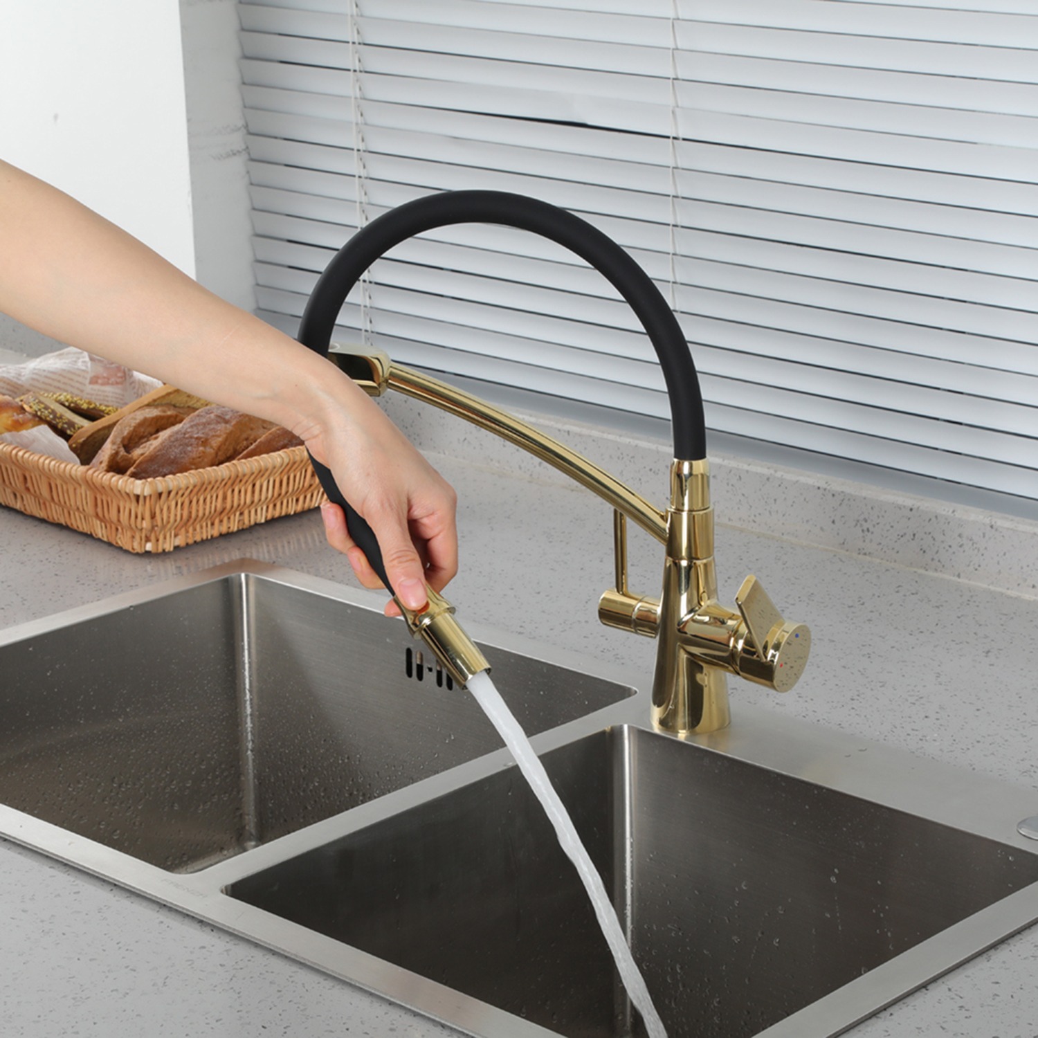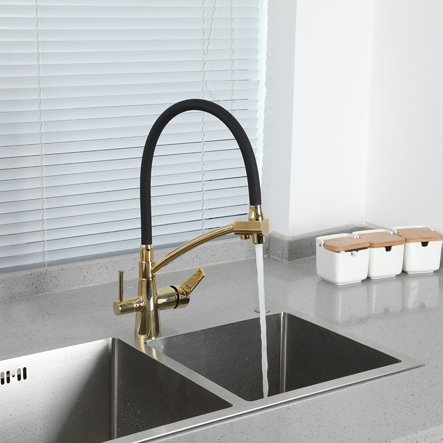 Смеситель для кухни Gappo G4398-13 с гибким изливом и подключением фильтра, материал - латунь, цвет - золото/черный.